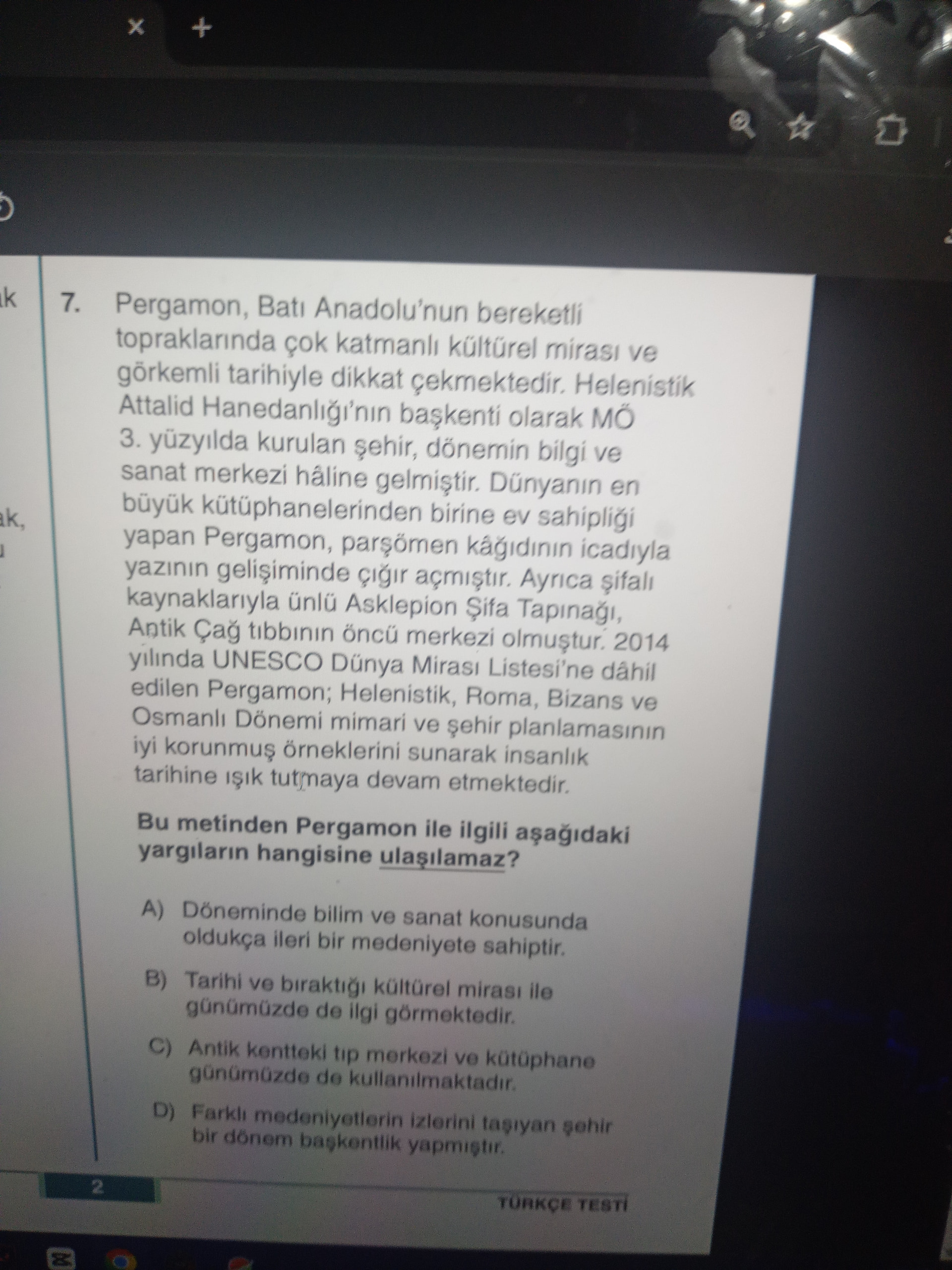 Genel açıklama: Görsel, Pergamon’un tarihî ve kültürel önemini anlatan bir paragraf ile buna ilişkin bir çoktan seçmeli anlama sorusunu içeren bir Türkçe test sorusudur. Konu; Pergamon’un antik çağdaki bilim, sanat, kütüphane ve tıp merkezi (Asklepion) önemi ile UNESCO Dünya Mirası statüsü ve farklı dönemlere ait mimarî mirasıdır.