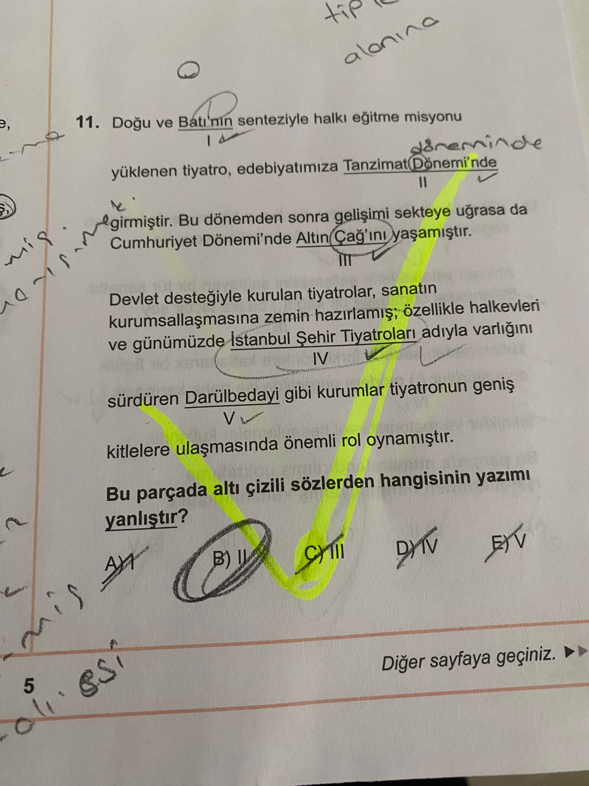 Görsel, Türkçe dersi çoktan seçmeli bir soruda tiyatronun Tanzimat ve Cumhuriyet dönemlerindeki gelişiminden söz ederek altı çizili ifadelerden hangisinin yazımının yanlış olduğunu sorgulayan bir metni içeriyor. Ayrıca bazı el yazısı notları ve işaretlemeler bulunuyor.