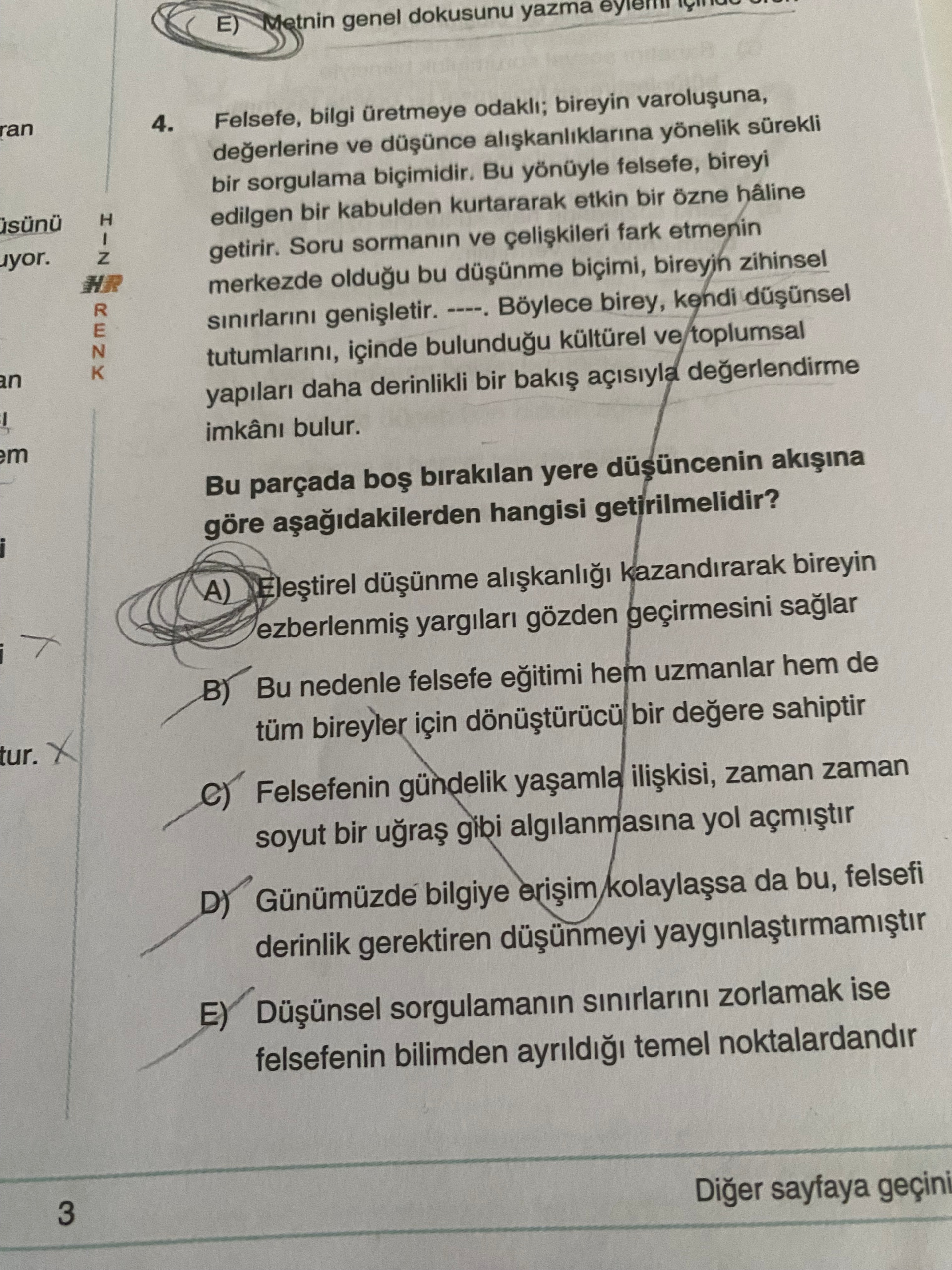 Genel açıklama: Görsel, bir test kitabındaki çoktan seçmeli Türkçe paragraf/sözel mantık sorusunu içeriyor. Parçada felsefenin tanımı, sorgulama ve eleştirel düşünme vurgulanıyor ve boşluğa uygun cümlenin seçeneklerden seçilmesi isteniyor. Ayrıca sayfa kenarında “HIZ/RENK” ibareleri ve sayfa yönlendirmesi bulunuyor.