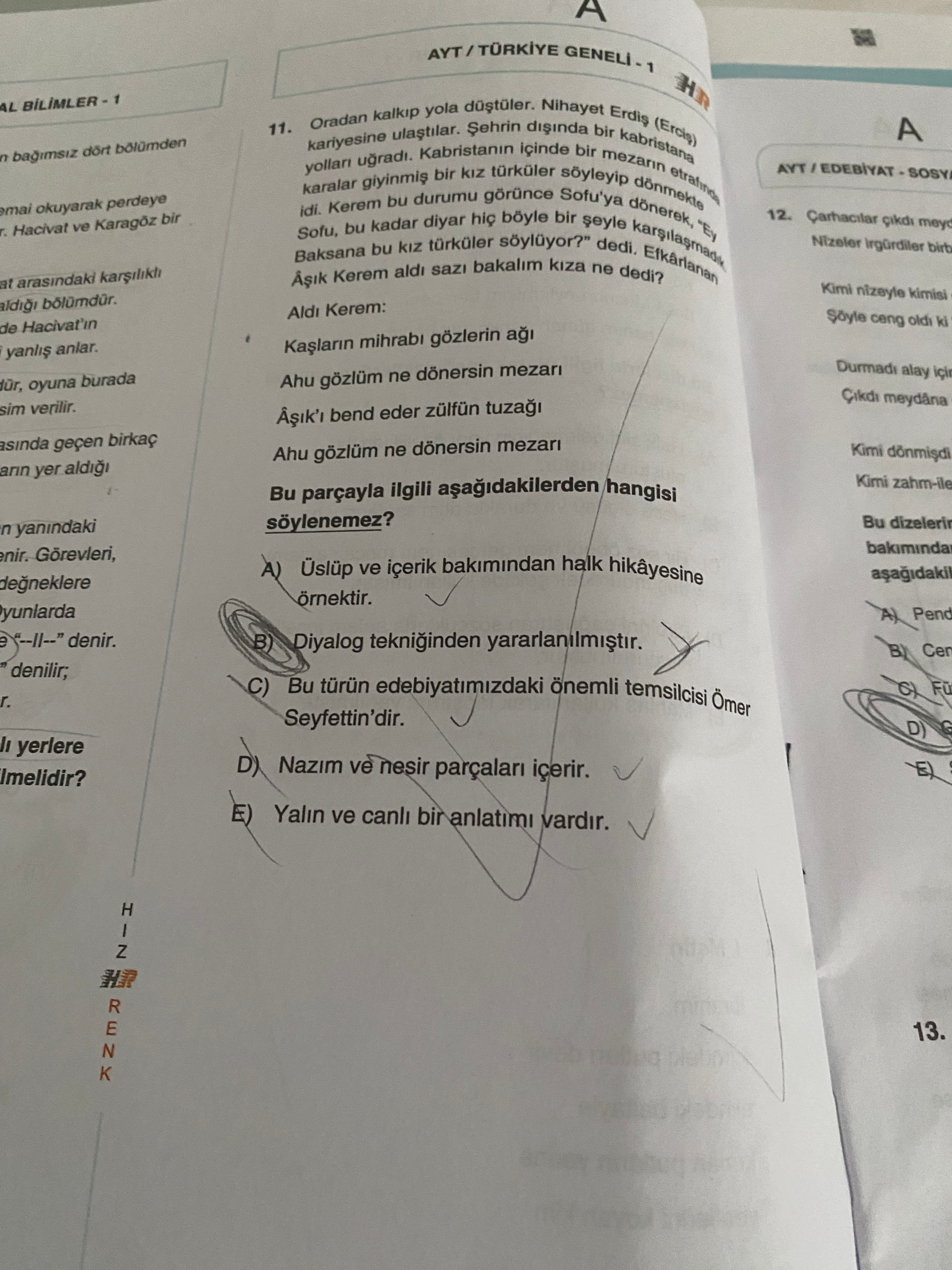 Görüntü, AYT düzeyi Türk Dili ve Edebiyatı deneme sınavından bir sayfayı içeriyor. Bir halk hikâyesi anlatımına benzeyen parça (Kerem temalı) verilmiş ve bu parçayla ilgili çoktan seçmeli bir yorum sorusu soruluyor. Sağ sayfada bir sonraki sorunun başlığı kısmen görünüyor.