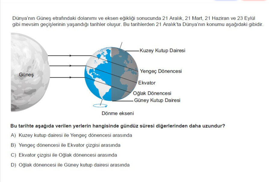 D şıkkı: Oğlak dönencesi ile Güney kutup dairesi arasında, 21 Aralık tarihinde diğer bölgelere göre gündüz süresi daha uzundur.