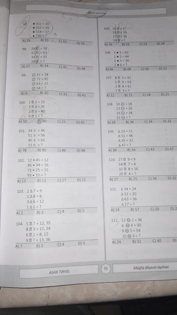 Görsel bir matematik testine aittir. Farklı sembollerle belirtilmiş işlemlerin sonuçlarını tahmin etmeyi içeren sorular bulunmaktadır.