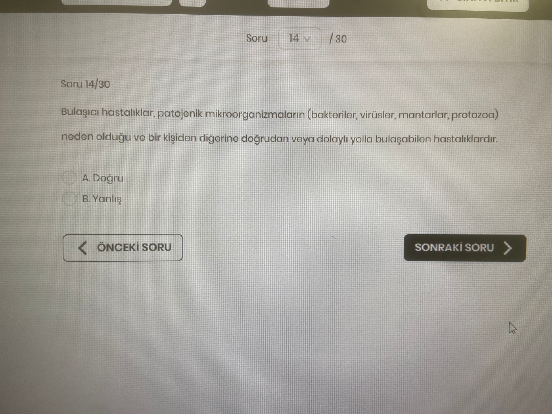 Genel açıklama: Görsel, çevrimiçi bir sınav arayüzünde bulaşıcı hastalıkların tanımıyla ilgili bir doğru/yanlış sorusunu göstermektedir.