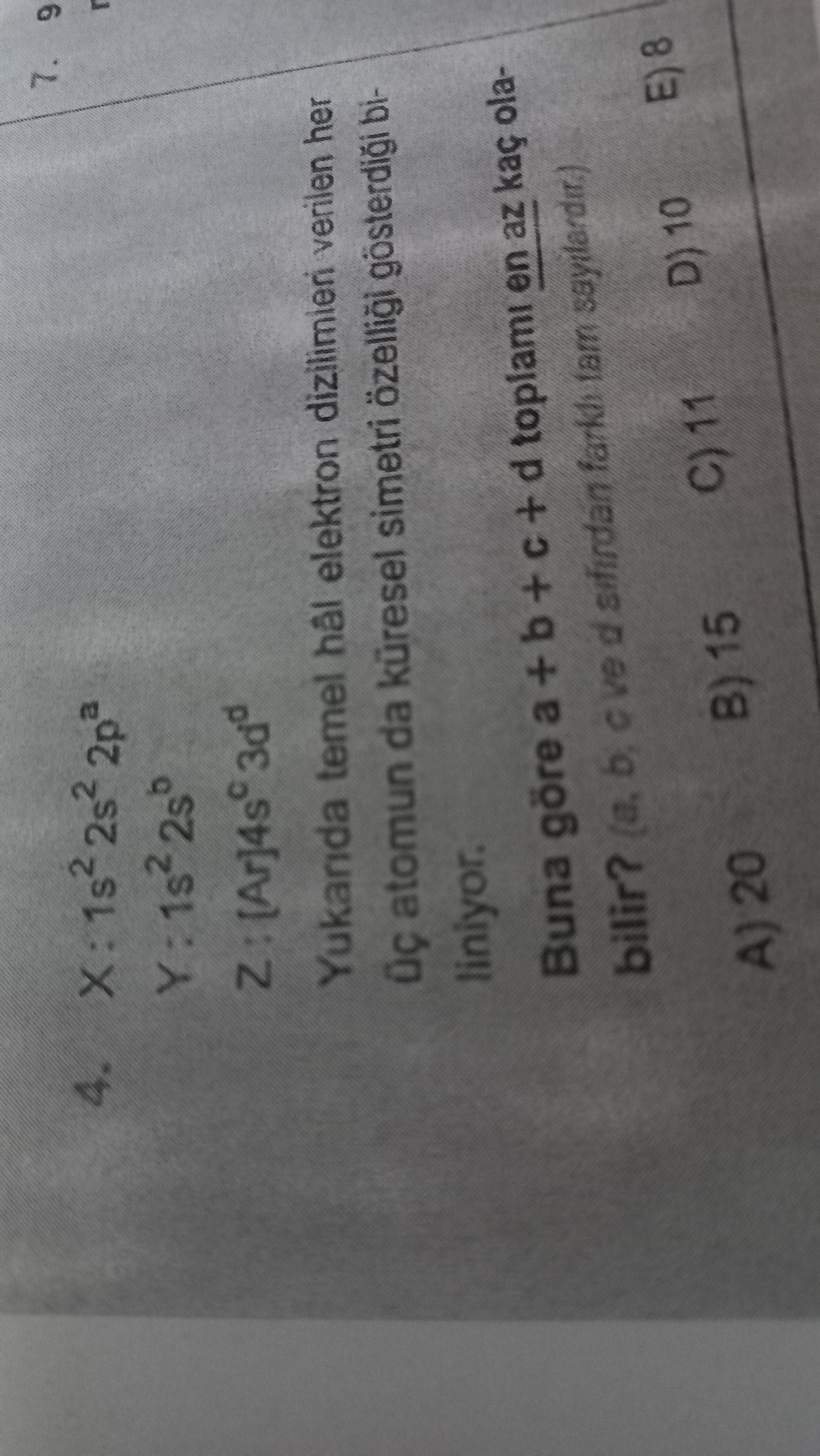 Z: 1s^{2} 4p^{4} 3s^{c} 3d^{d} (buradaki dizilim net seçilemiyor, ama p, s, d orbitalleri ve üslerde c, d var)