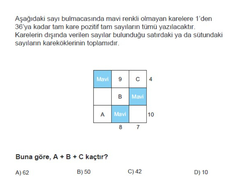- Doğru kombinasyon: 9, 1, 16, 25, 36 ve 4 ile her satır/sütunu sağlayan tek değer toplamı olan A+B+C = 50’dir.