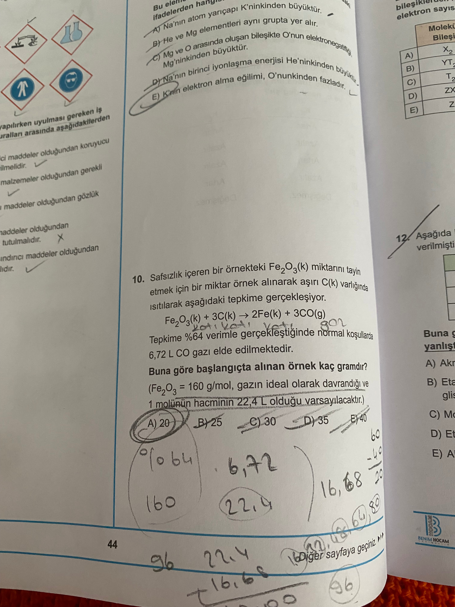 Genel olarak görüntü, kimya dersi soru bankasından sayfalar içeriyor: periyodik özellikler (yarıçap, iyonlaşma enerjisi, elektronegatiflik, elektron alma eğilimi) ile ilgili çoktan seçmeli bir soru ve Fe2O3’ün C ile indirgenmesi tepkimesine dayalı, verim ve ideal gaz hesaplamalarını içeren stokiyometri sorusu; ayrıca iş güvenliği/simge görselleri yer alıyor.