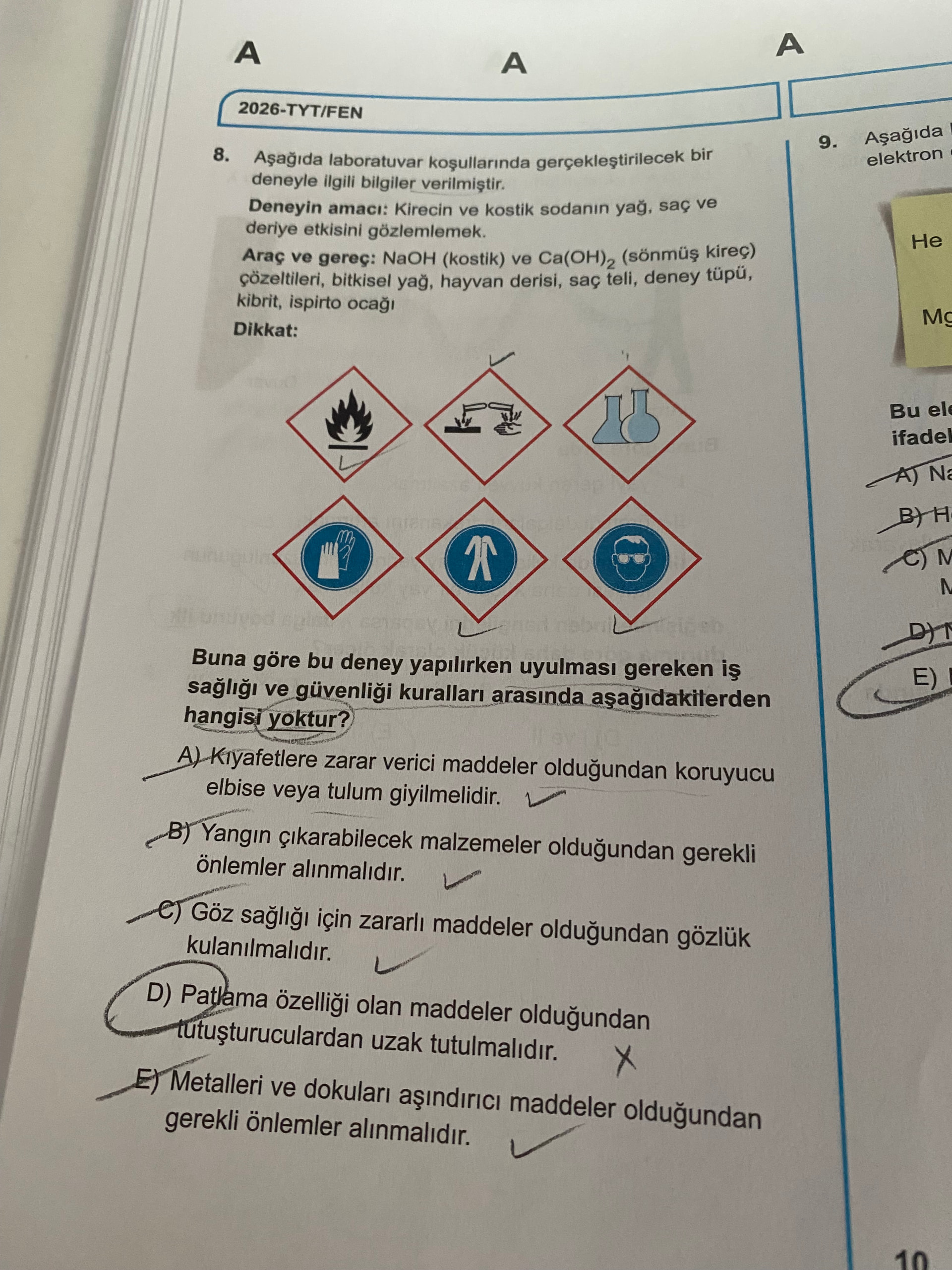 Görüntü, TYT/Fen alanından laboratuvar güvenliği konulu bir çoktan seçmeli soru içeriyor. NaOH ve Ca(OH)2 ile yapılan deneyde güvenlik uyarıları ve piktogramlar verilerek hangi iş sağlığı ve güvenliği kuralının uygun olmadığı soruluyor.