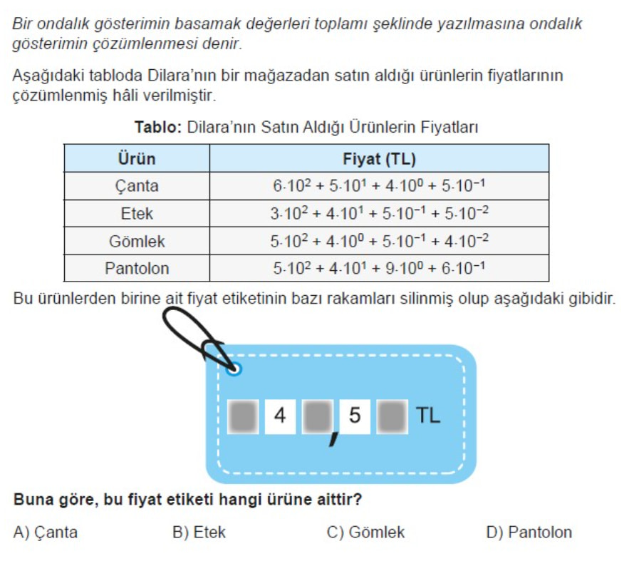 Aşağıdaki tabloda Dilara’nın bir mağazadan satın aldığı ürünlerin fiyatlarının çözümlemiş hâli verilmiştir.