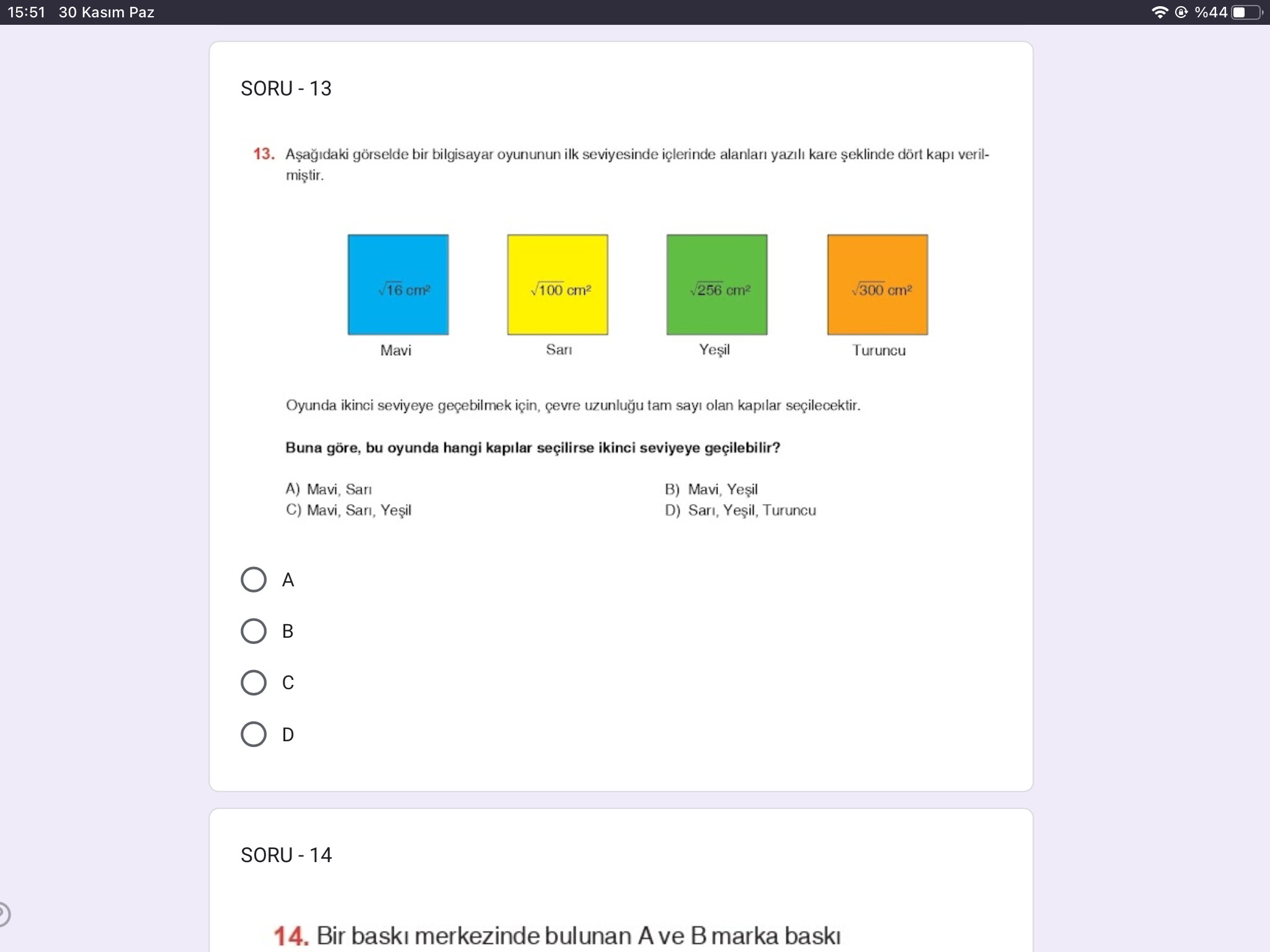 İkinci seviyeye geçmek için çevre uzunluğu tam sayı olan kapılar seçilecek.