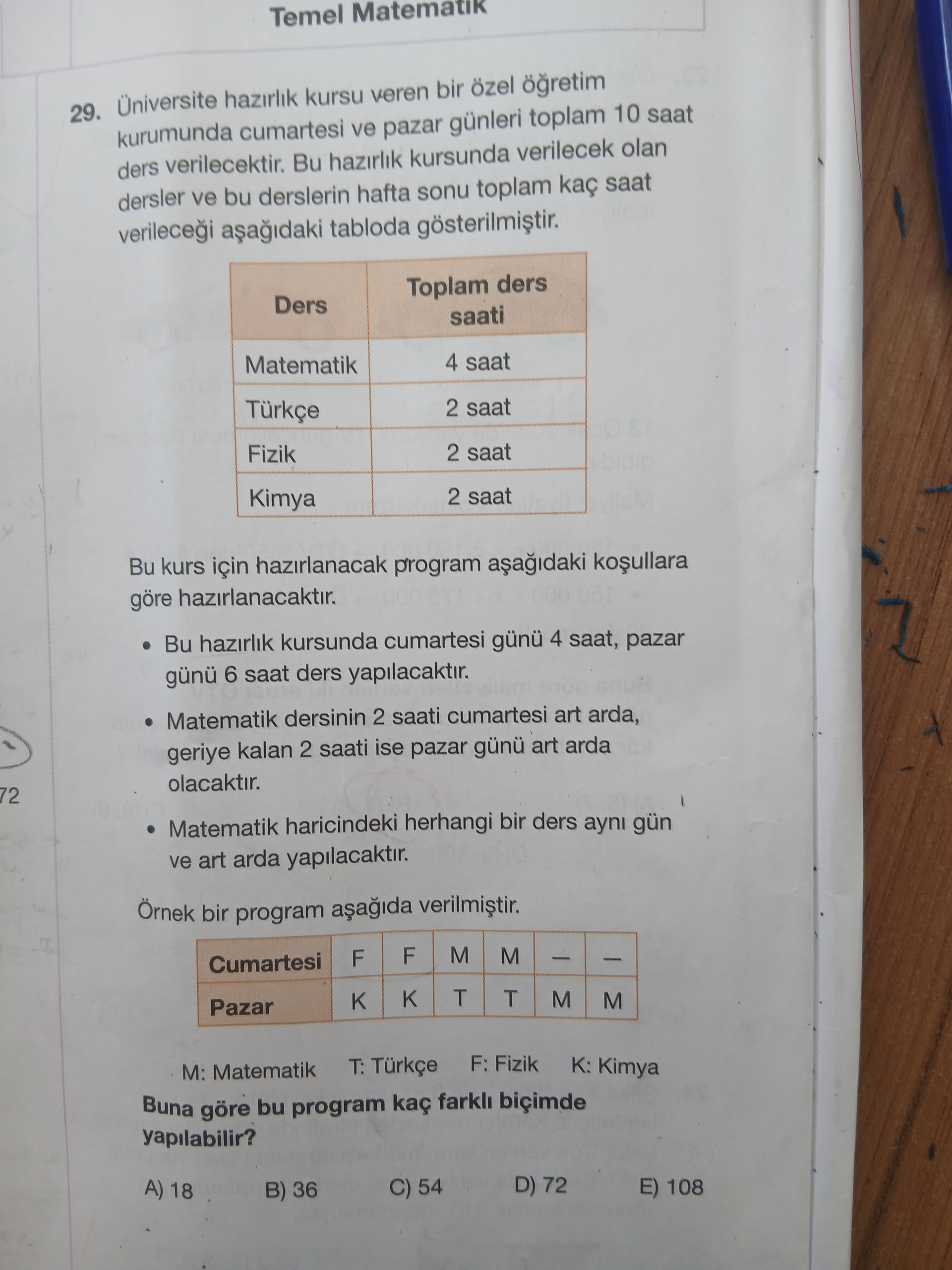 Genel açıklama: Görsel, bir test kitabındaki temel matematik konusu kapsamında, hafta sonu kurs programının ders saatlerine göre kaç farklı şekilde düzenlenebileceğini soran bir kombinatorik yerleştirme problemidir; tabloda ders saatleri ve koşullar verilmiştir.