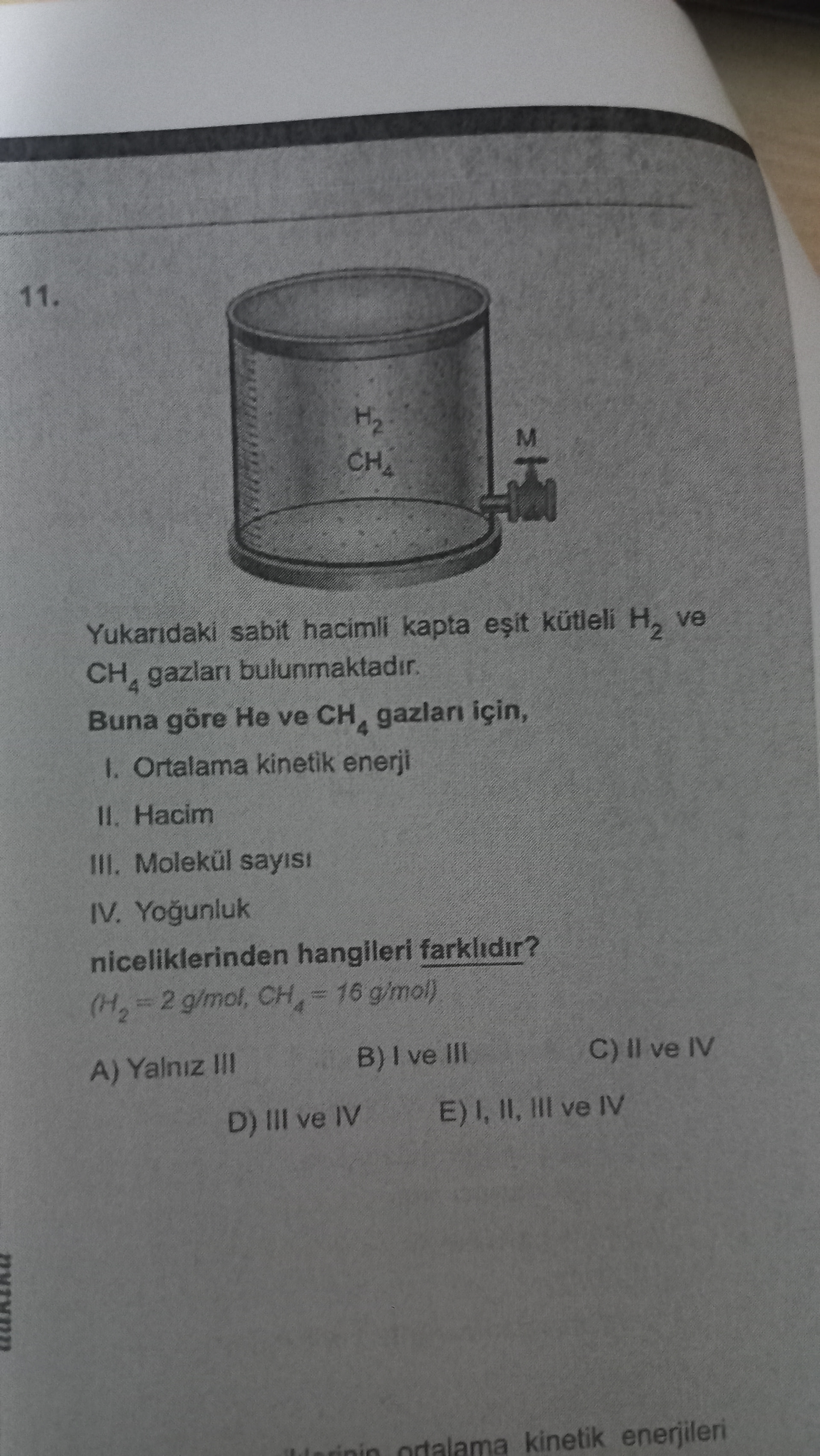 Aynı kapta, sabit hacim ve aynı sıcaklıkta iki gaz var: H_2 ve CH_4, üstelik kütleleri eşit.