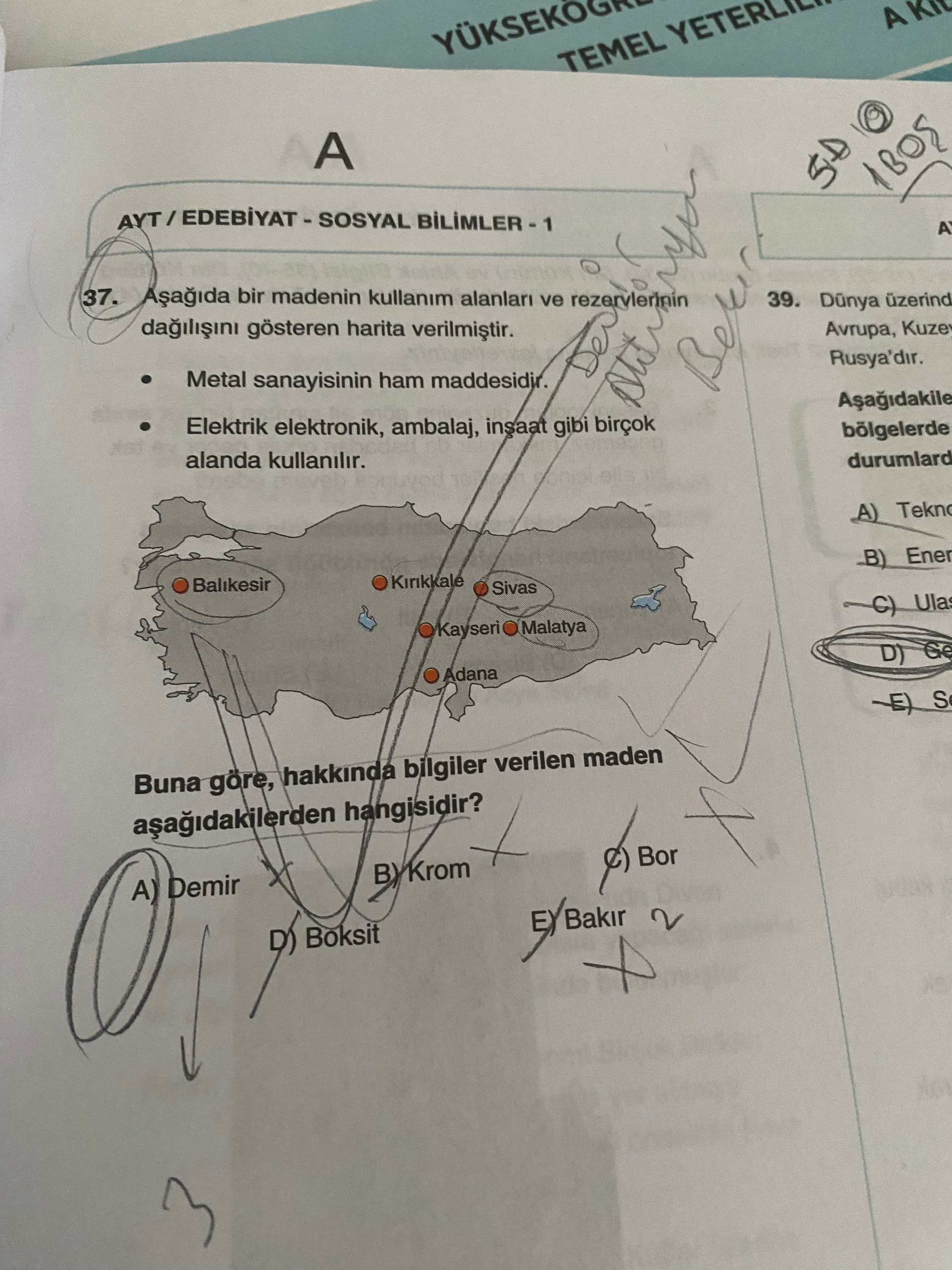 Bu görsel, AYT Edebiyat - Sosyal Bilimler 1 testinden bir coğrafya sorusudur; Türkiye’de bir madenin kullanım alanları ve rezerv dağılımına bakarak hangi maden olduğunun belirlenmesini ister.
