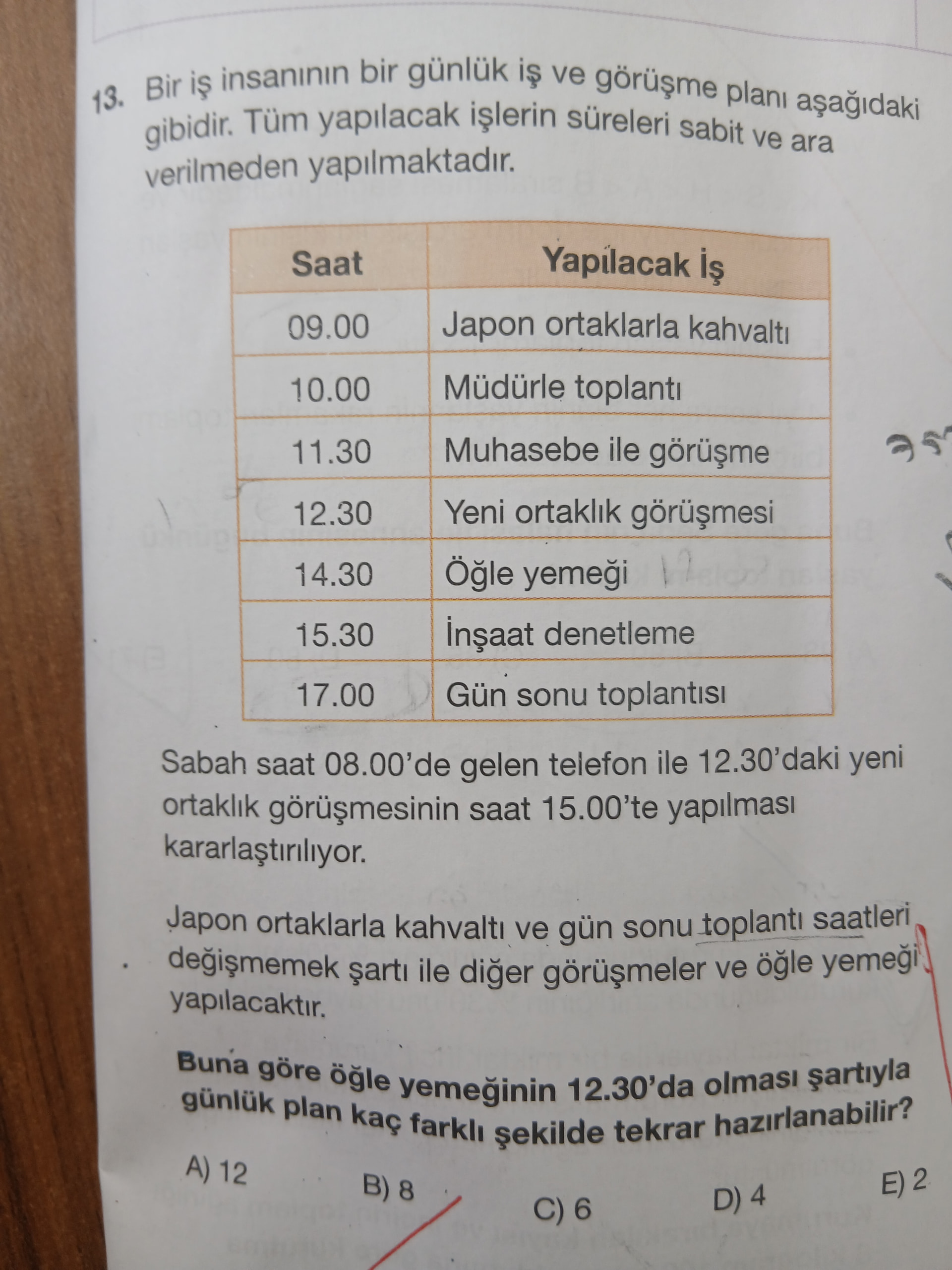 - Soruda ayrıca öğle yemeğinin 12:30–13:30 olması şartı konuyor.