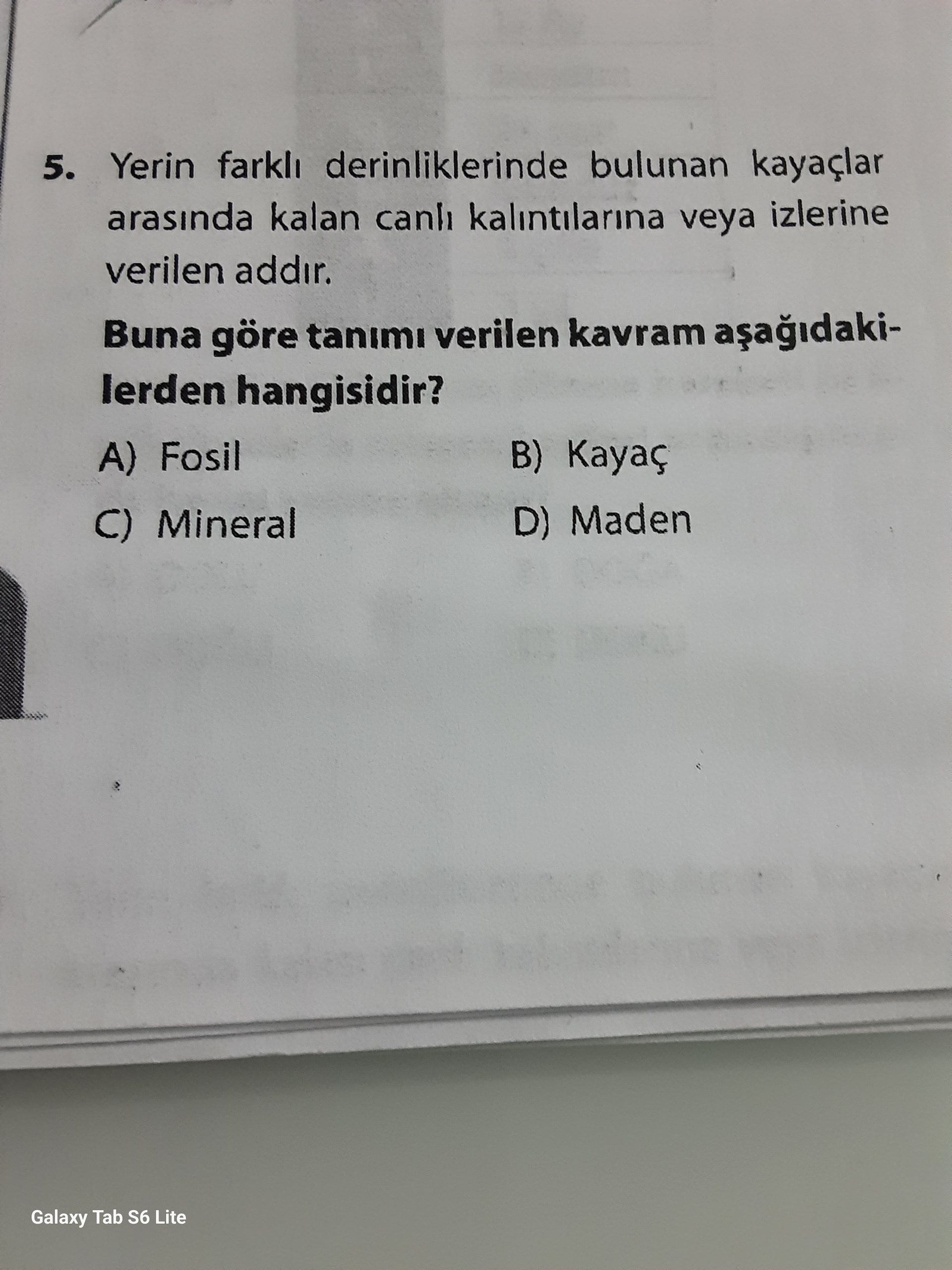 Soruda, “Yerin farklı derinliklerinde bulunan kayalar arasında kalan canlı kalıntılarına veya izlerine verilen ad” tanımlanıyor. Bu tanım fosil kavramını karşılar.