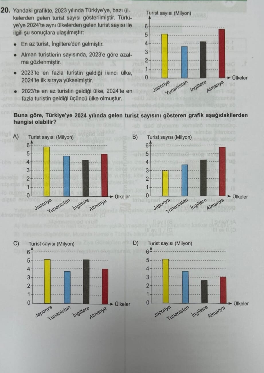 “2023’te en fazla turistin geldiği ikinci ülke, 2024’te ilk sıraya yükselmiştir.” ifadesiyle kastedilen ülke Japonya’dır (bazı baskılarda 2023 grafiğinde Japonya 4, Almanya 5 gösteriliyor). O durumda 2024’te en fazla Japonya olmalıdır.