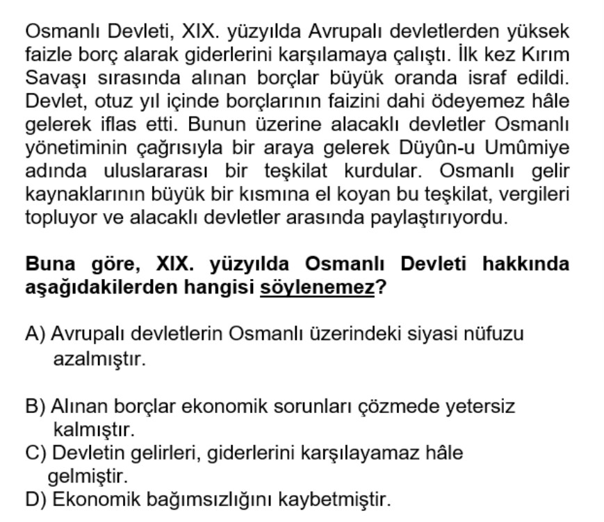 Genel açıklama: Metin, 19. yüzyılda Osmanlı Devleti’nin dış borçlanması, bu borçların israf edilmesi, iflas süreci ve alacaklıların kurduğu Düyûn-u Umûmiye ile Osmanlı’nın gelirlerine el konulması üzerinden ekonomik bağımlılığını anlatan bir paragraf ve buna bağlı çoktan seçmeli bir tarih sorusudur.