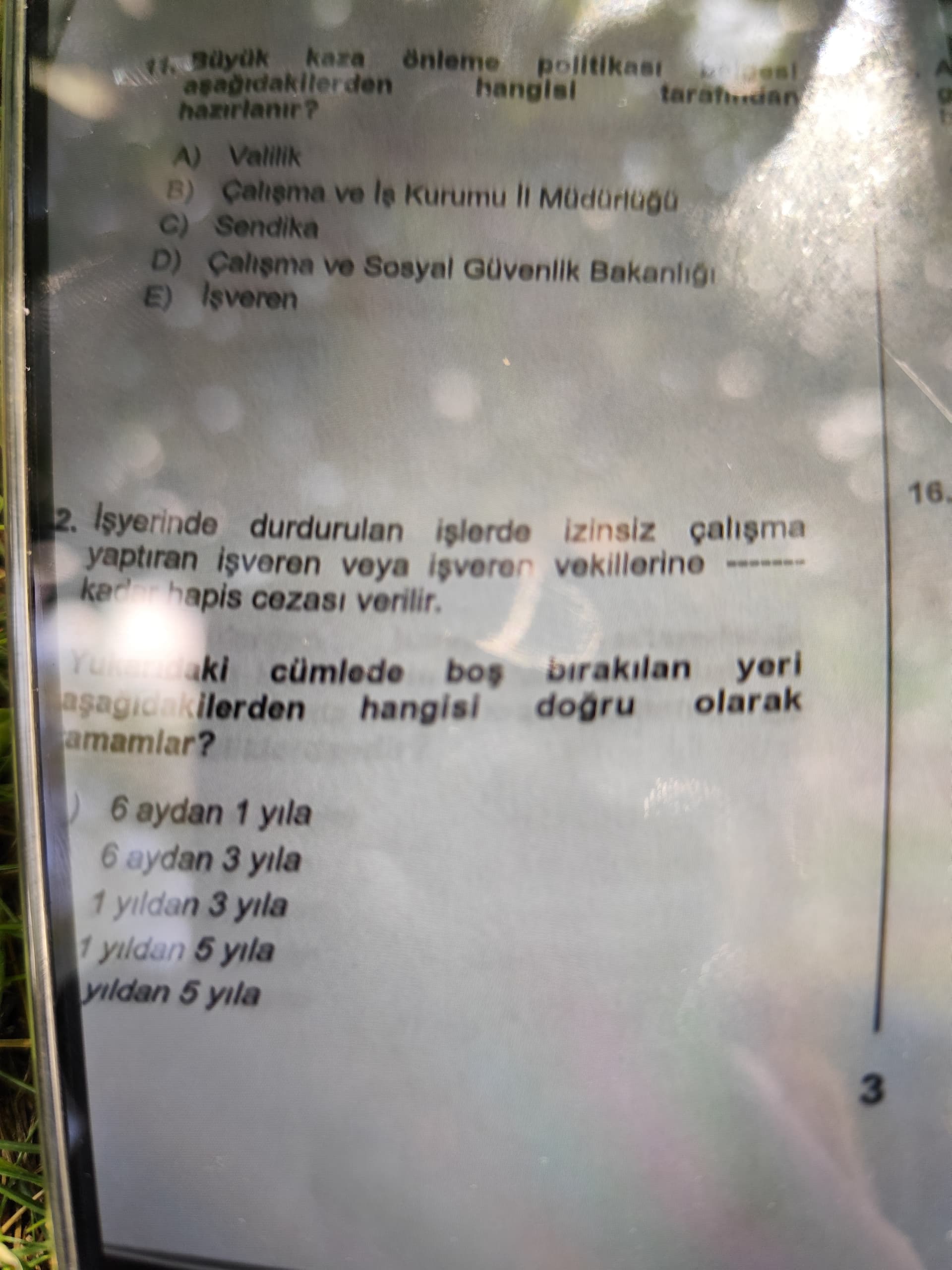 Bu resim, iş güvenliği ve çalışma mevzuatıyla ilgili bir sınav sorusu içermektedir. Bir belge hazırlama sorusu ve ceza durumu hakkında bilgi veren bir soru bulunmaktadır.