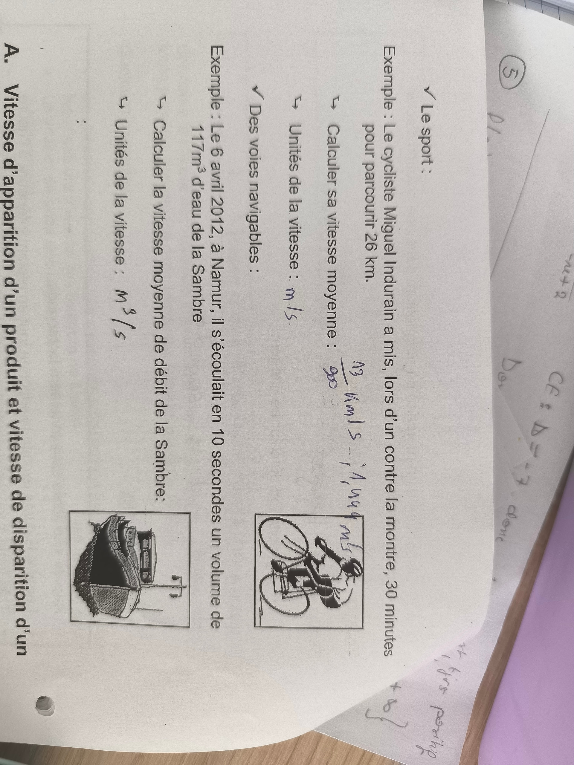Résumé: La page propose deux situations pour calculer une vitesse moyenne et un débit: un cycliste parcourant 26 km en 30 minutes et l’écoulement de 117\ \text{m}^3 d’eau en 10 s, avec rappel des unités \,\text{m/s}\, et \,\text{m}^3/\text{s}\,.