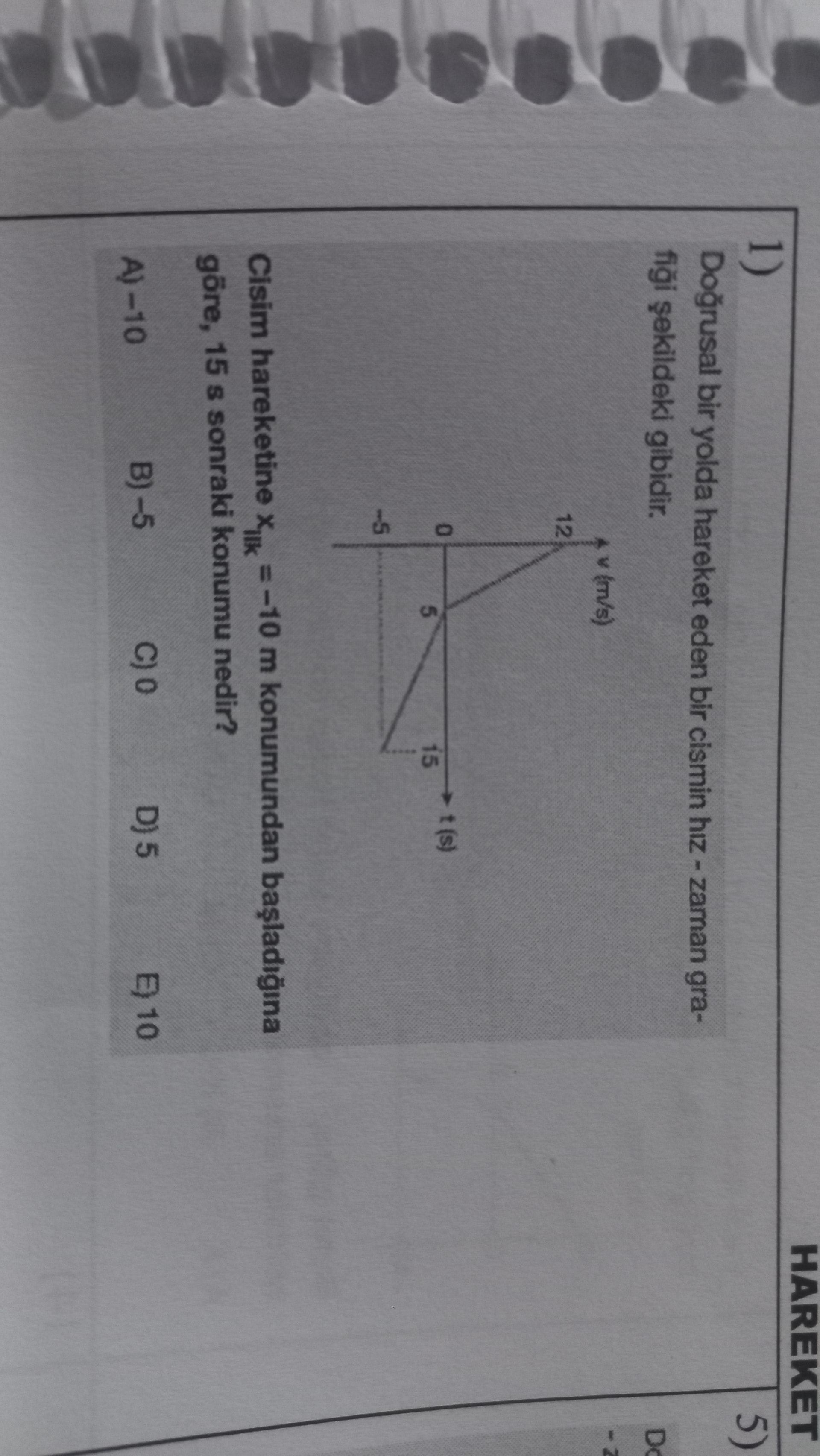 Fotoğraf düşük çözünürlüklü olduğu için çizim net ayırt edilemiyor; fakat çoğu MEB tarzı soruda bu tip grafikten çıkan son konum genellikle -5 \ \text{m} oluyor ve şıklar da bunu destekliyor.