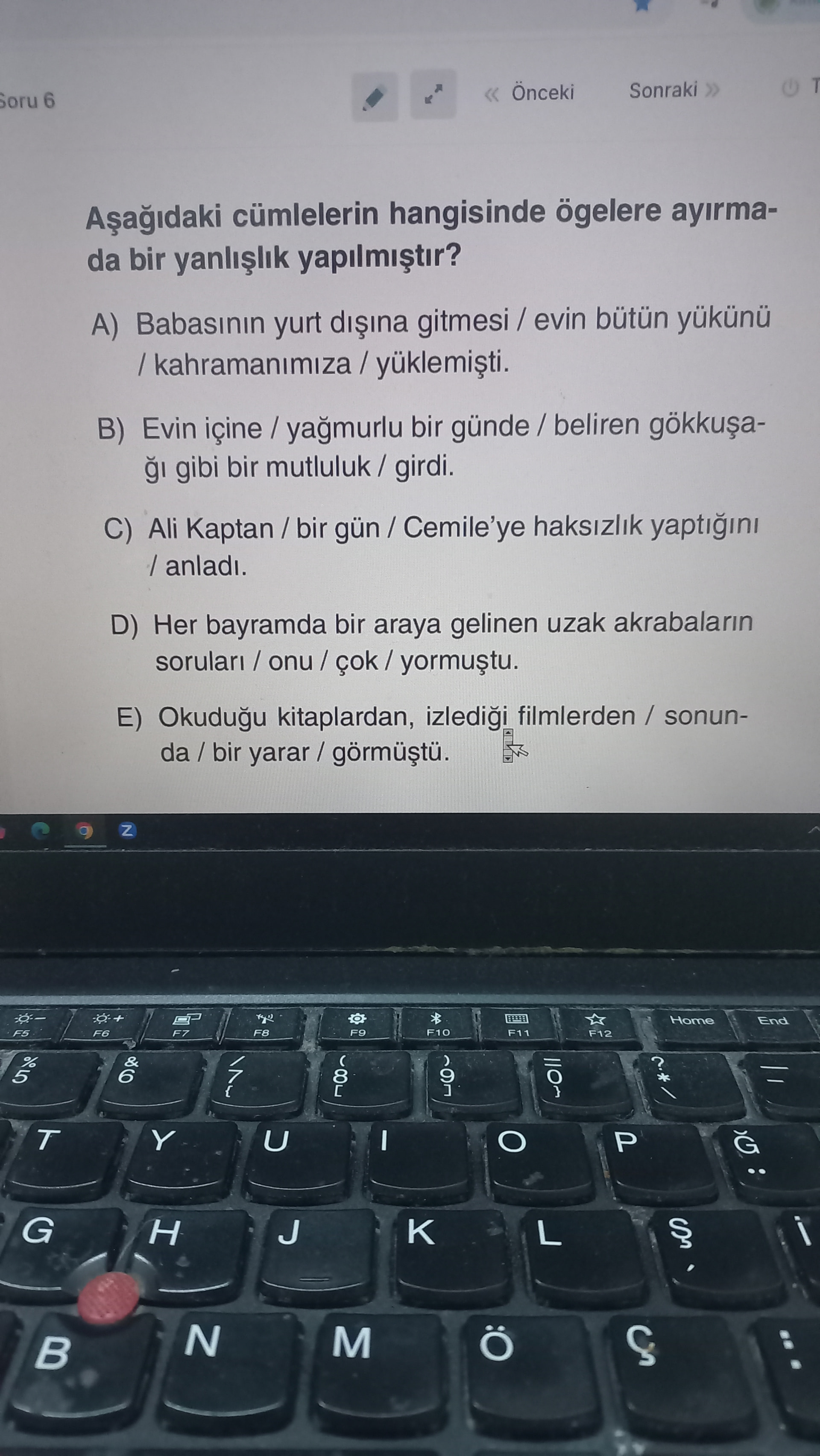 Özet: Görsel, Türkçe dil bilgisinde cümle öğelerine ayırma konulu çoktan seçmeli bir soruyu içeriyor; beş seçenekli cümlelerde ögeler eğik çizgiyle ayrılmış ve hangi seçenekte yanlış ayrım yapıldığını soruyor.