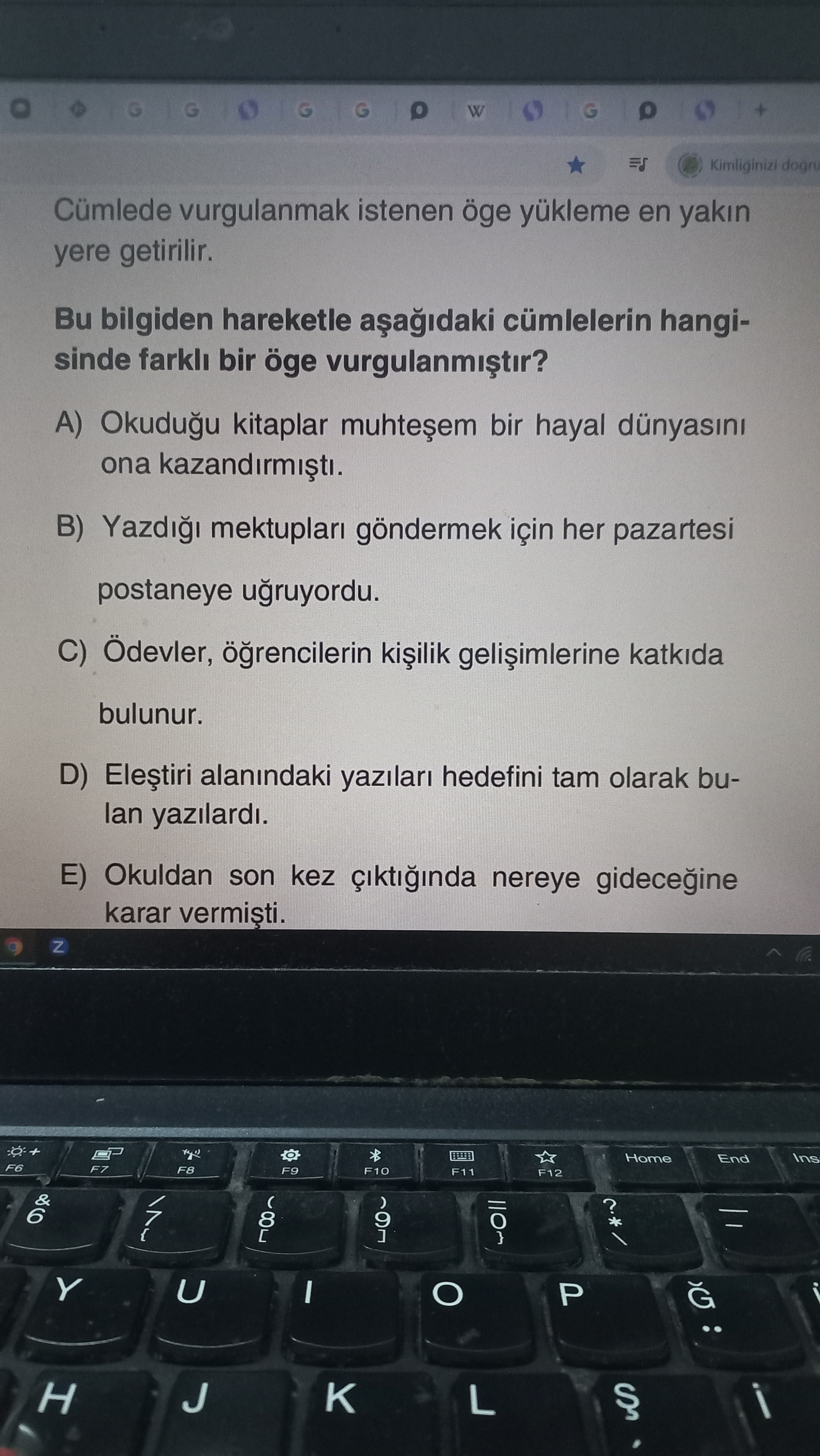 Özet: Metin, cümlede vurgunun yükleme en yakın öge ile sağlandığını belirtip A-E seçeneklerinde verilen cümlelerden hangisinde farklı bir ögenin vurgulandığını soran çoktan seçmeli bir sorudur.