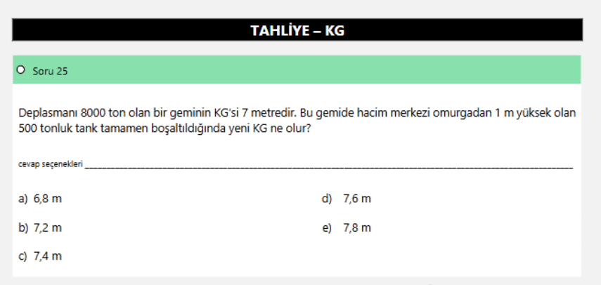 Deplasmanı 8000 ton olan bir geminin KG’si 7 metredir. Bu gemide hacim merkezi omurgadan 1 m yüksek olan 500 tonluk tank tamamen boşaltıldığında yeni KG ne olur?