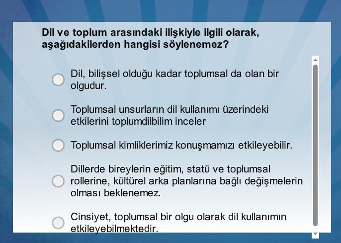 - Birinci, üçüncü ve beşinci şıklar dil ile toplum arasındaki ilişkiler açısından doğrudur: dil hem bilişsel hem toplumsal bir olgudur, toplumsal kimlikler konuşmayı etkileyebilir, ve cinsiyet toplumsal bir olgu olarak dil kullanımını etkileyebilmektedir.