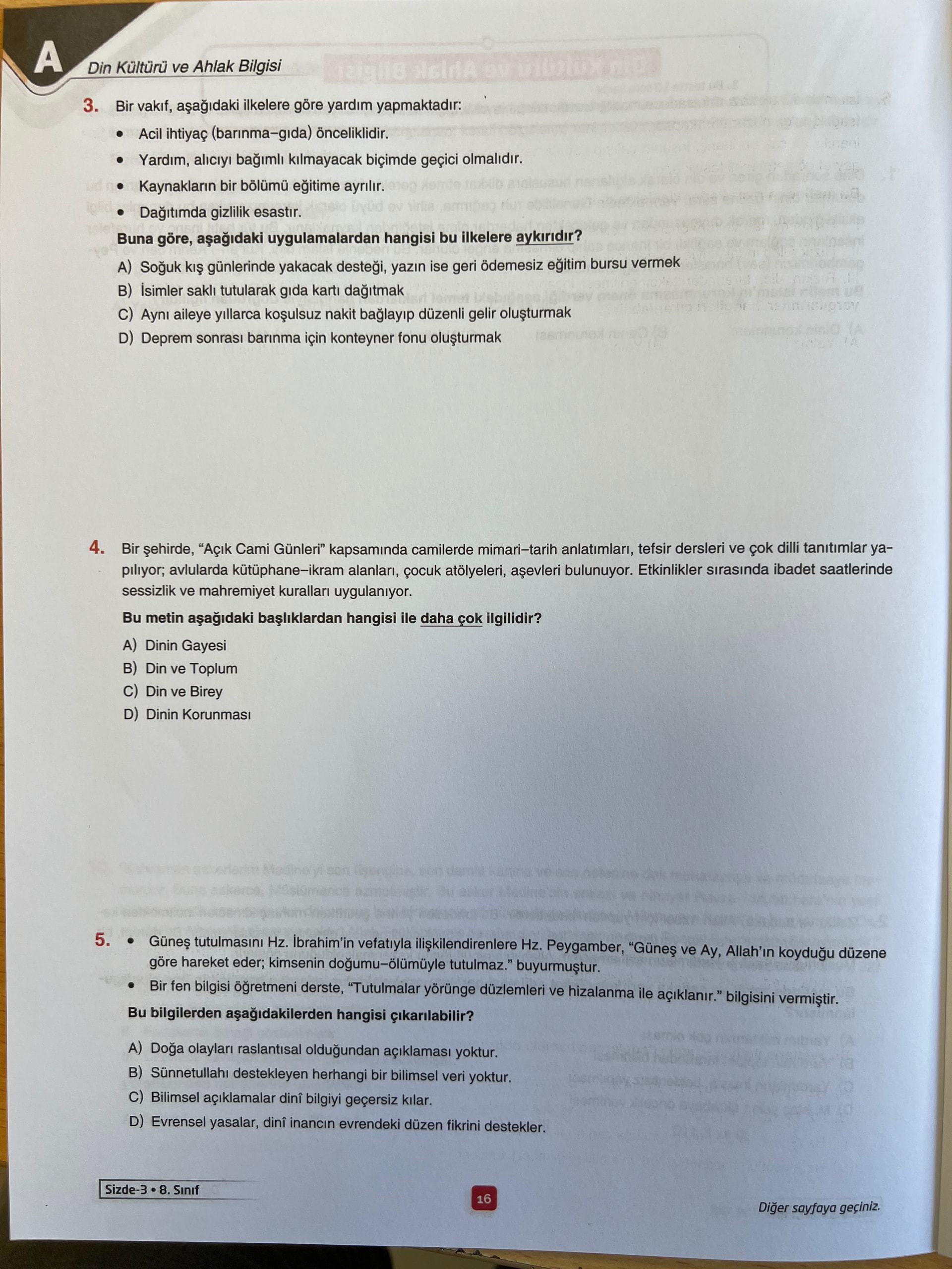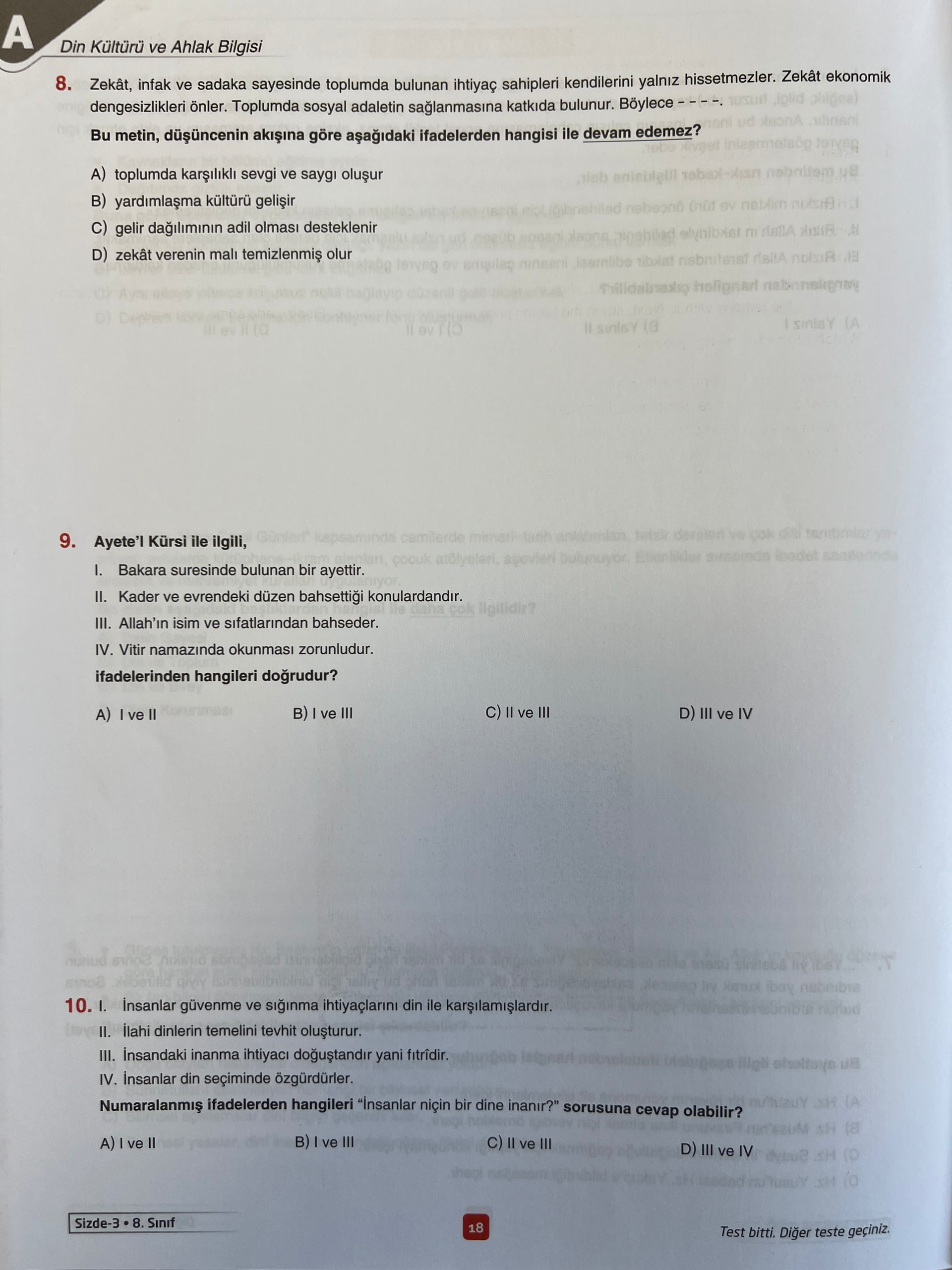 Özet: Görseller, 8. sınıf “Din Kültürü ve Ahlak Bilgisi” testinden dört sayfa içeriyor. Sorular; hurafe ve aklın korunması, zekât ve sadakada ihlas, vakıf yardım ilkeleri, din–toplum ilişkisi, evrendeki düzen ve sünnetullah, rızık–kader ilişkisi, Yusuf suresindeki kıtlık–bereket yılları, zekâtın toplumsal etkileri, Ayete’l Kürsi bilgisi ve insanların dine inanma nedenleri gibi konuları çoktan seçmeli biçimde sorguluyor.
