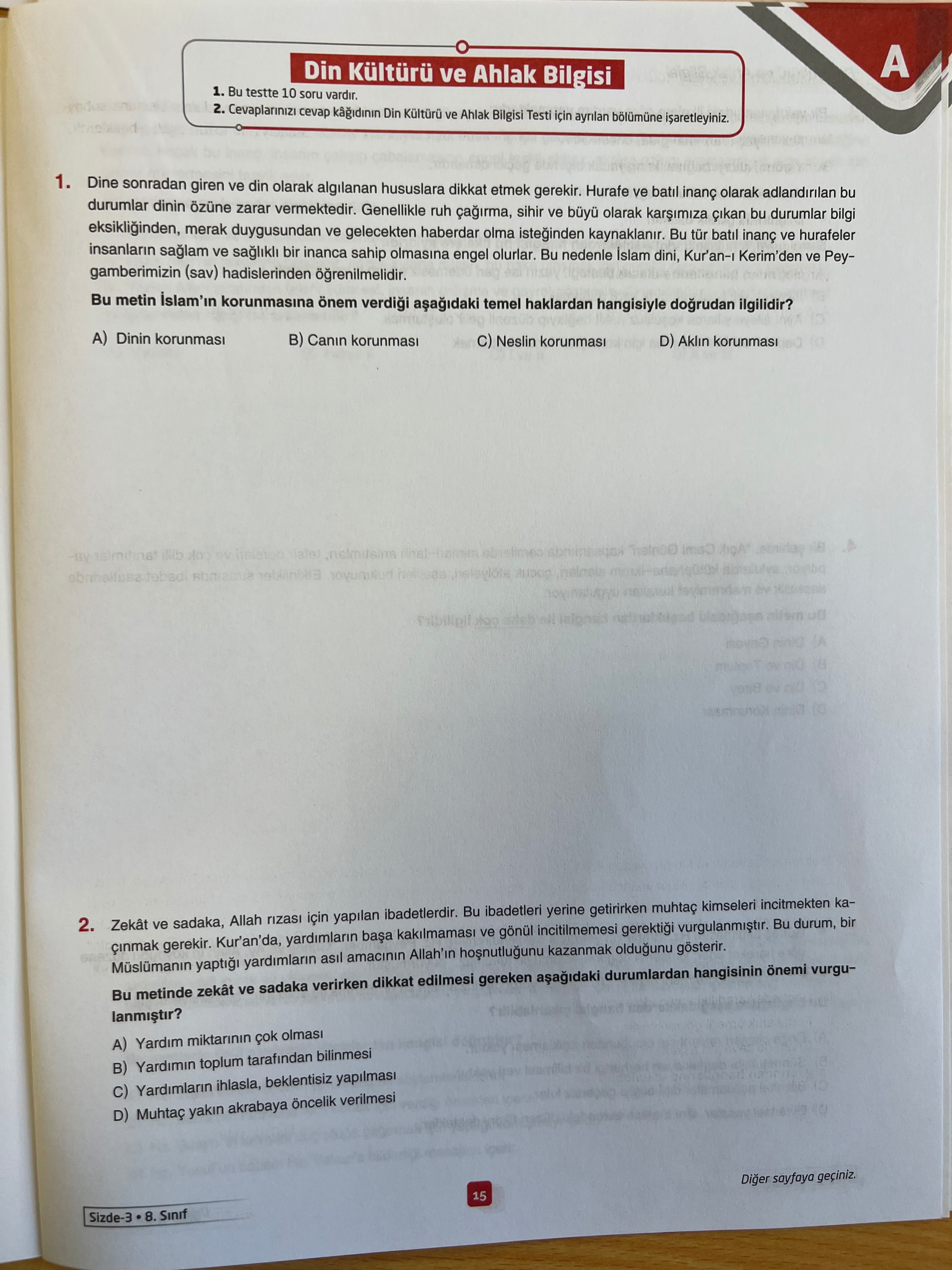 Cevaplarınızı cevap kağıdının Din Kültürü ve Ahlak Bilgisi Testi için ayrılan bölümüne işaretleyiniz.