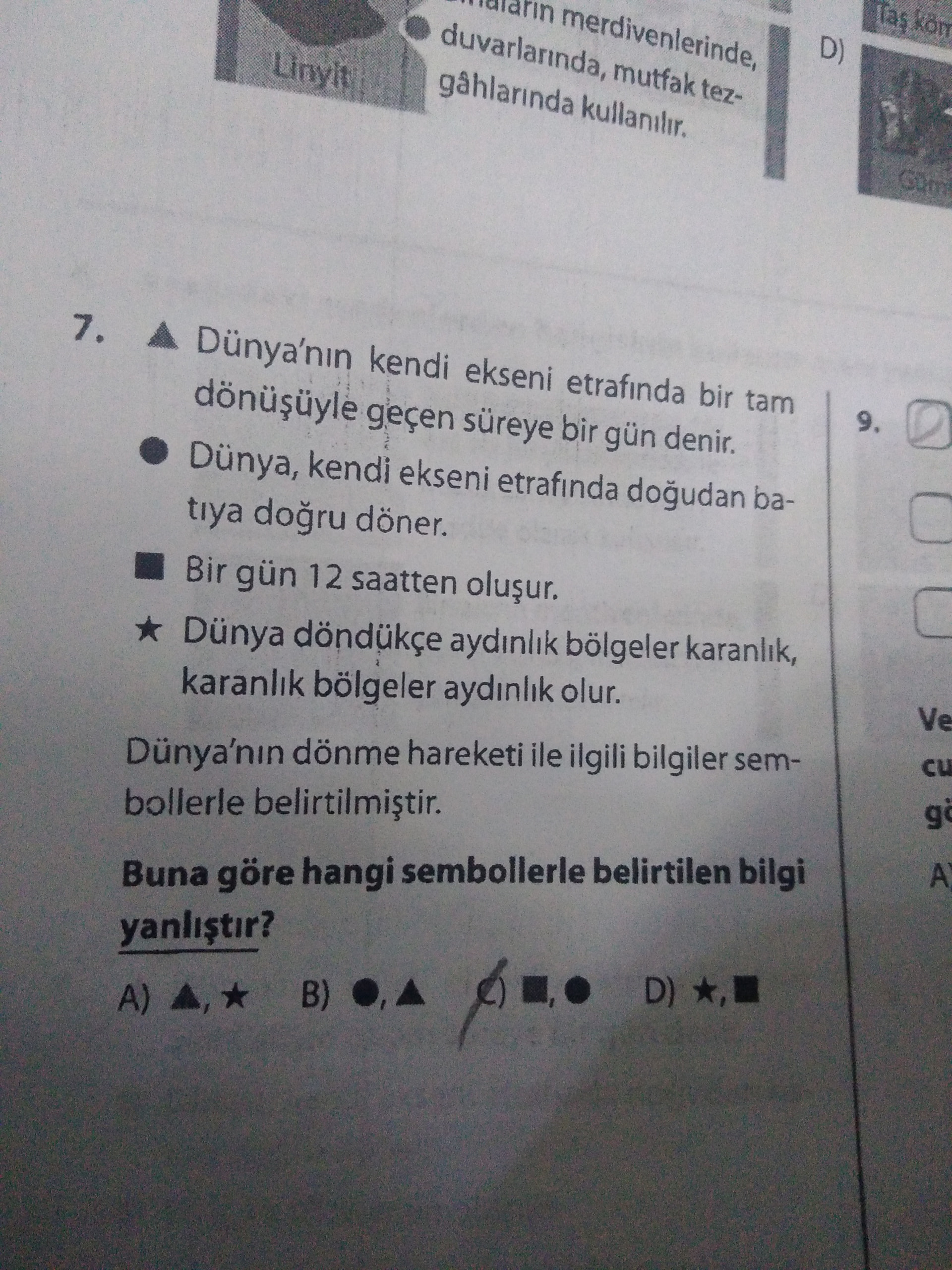 Cevap seçeneklerinde, yalnızca ■ işareti bulunan C şıkkı doğrudur çünkü “Bir gün 12 saatten oluşur.” ifadesi yanlıştır.