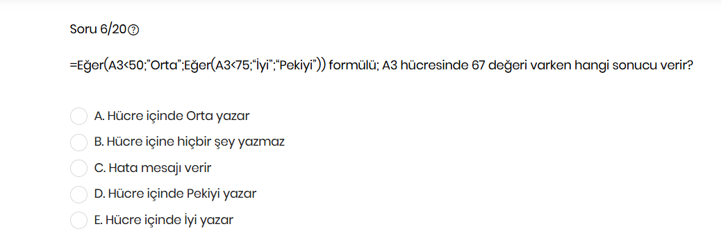 =Eğer(A3<50;“Orta”;Eğer(A3<75;“İyi”;“Pekiyi”)) formülü; A3 hücresinde 67 değeri varken hangi sonucu verir?