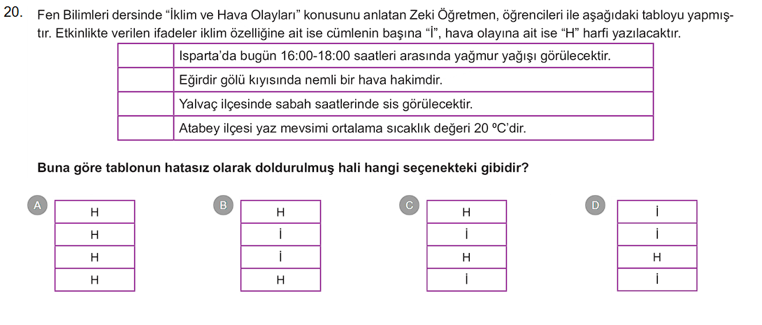 - Fen Bilimleri dersinde “İklim ve Hava Olayları” konusunu anlatan Zeki Öğretmen, öğrencileri ile aşağıdaki tabloyu yapmıştır. Etkinlikte verilen ifadeler iklim özelliğine ait ise cümlenin başına “İ”, hava olayına ait ise “H” harfi yazılacaktır.