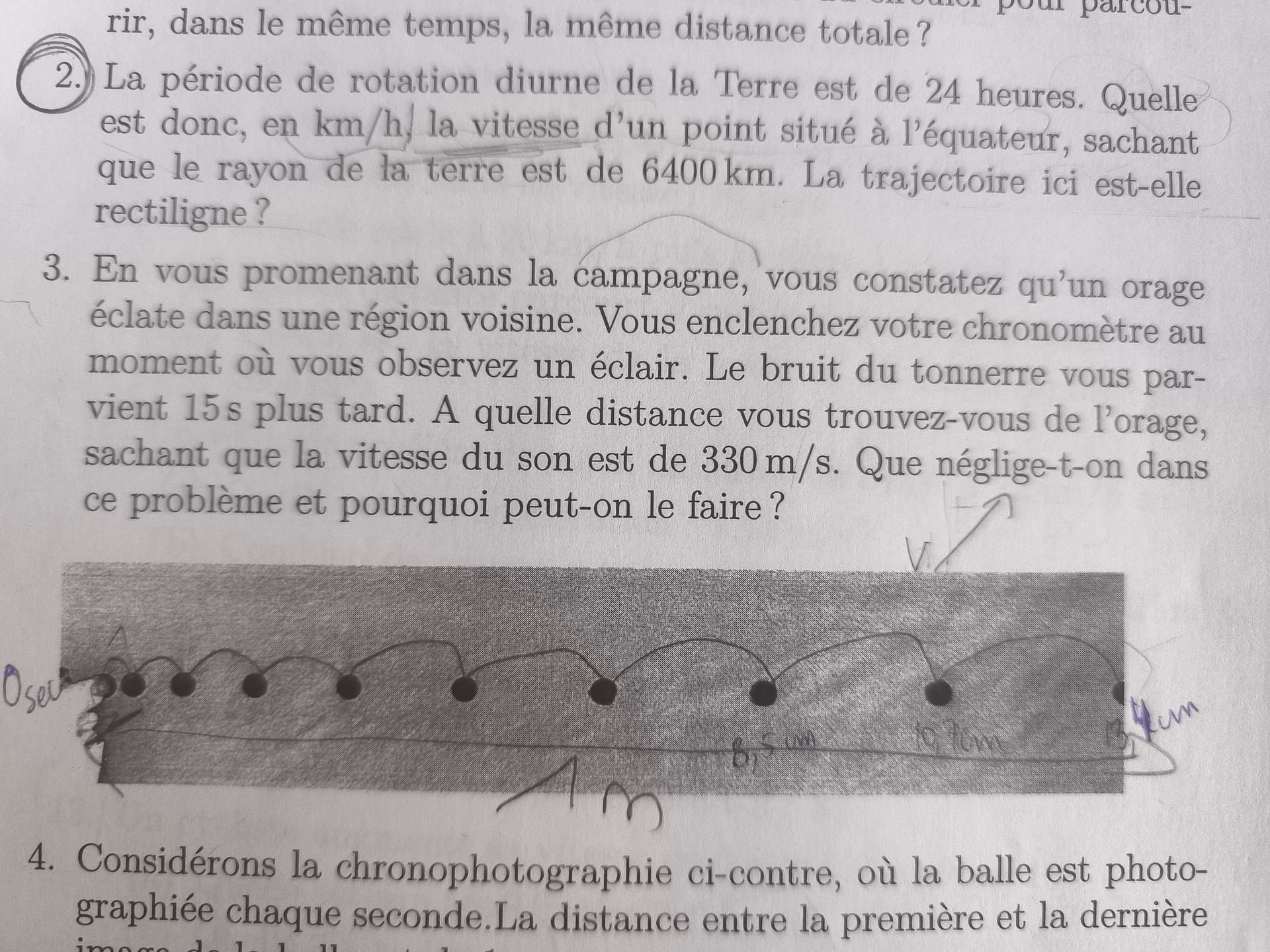 Oui — je peux expliquer et te montrer comment résoudre le problème 3. Cependant il me manque une donnée numérique importante : l’échelle (combien vaut une longueur mesurée sur la photo en mètres ou centimètres) ou la distance réelle entre deux repères. Sans échelle je peux donner la méthode et les formules ; si tu veux que je calcule des valeurs numériques, envoie la même image avec une règle posée sur la photo ou indique la longueur réelle correspondant à une distance sur l’image.