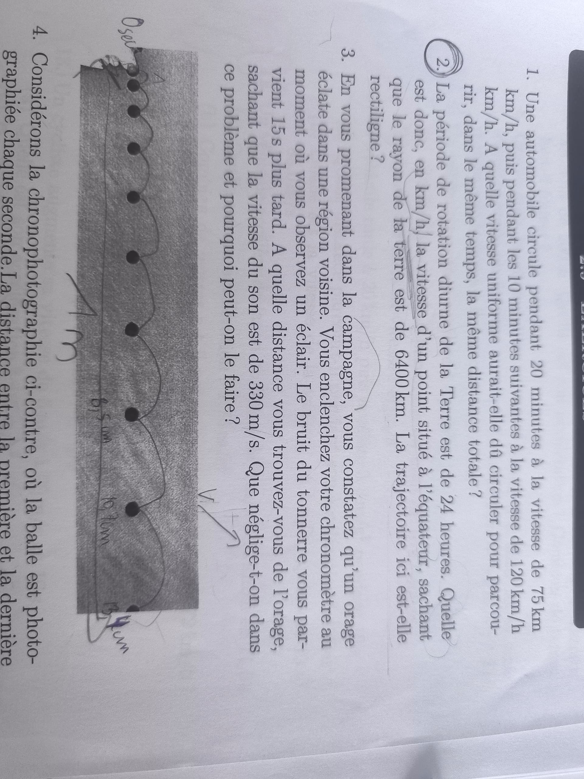 - Une automobile circule pendant 20 minutes à la vitesse de 75 km/h, puis pendant 10 minutes à la vitesse de 120 km/h. a) Quelle est la vitesse uniforme aurait permis à la voiture de parcourir dans le même temps, la même distance totale? b) La période de rotation diurne de la Terre est de 24 heures. Quelle est donc en km/h la vitesse d’un point situé à l’équateur, sachant que le rayon de la terre est de 6400 km. La trajectoire ici est-elle rectiligne?