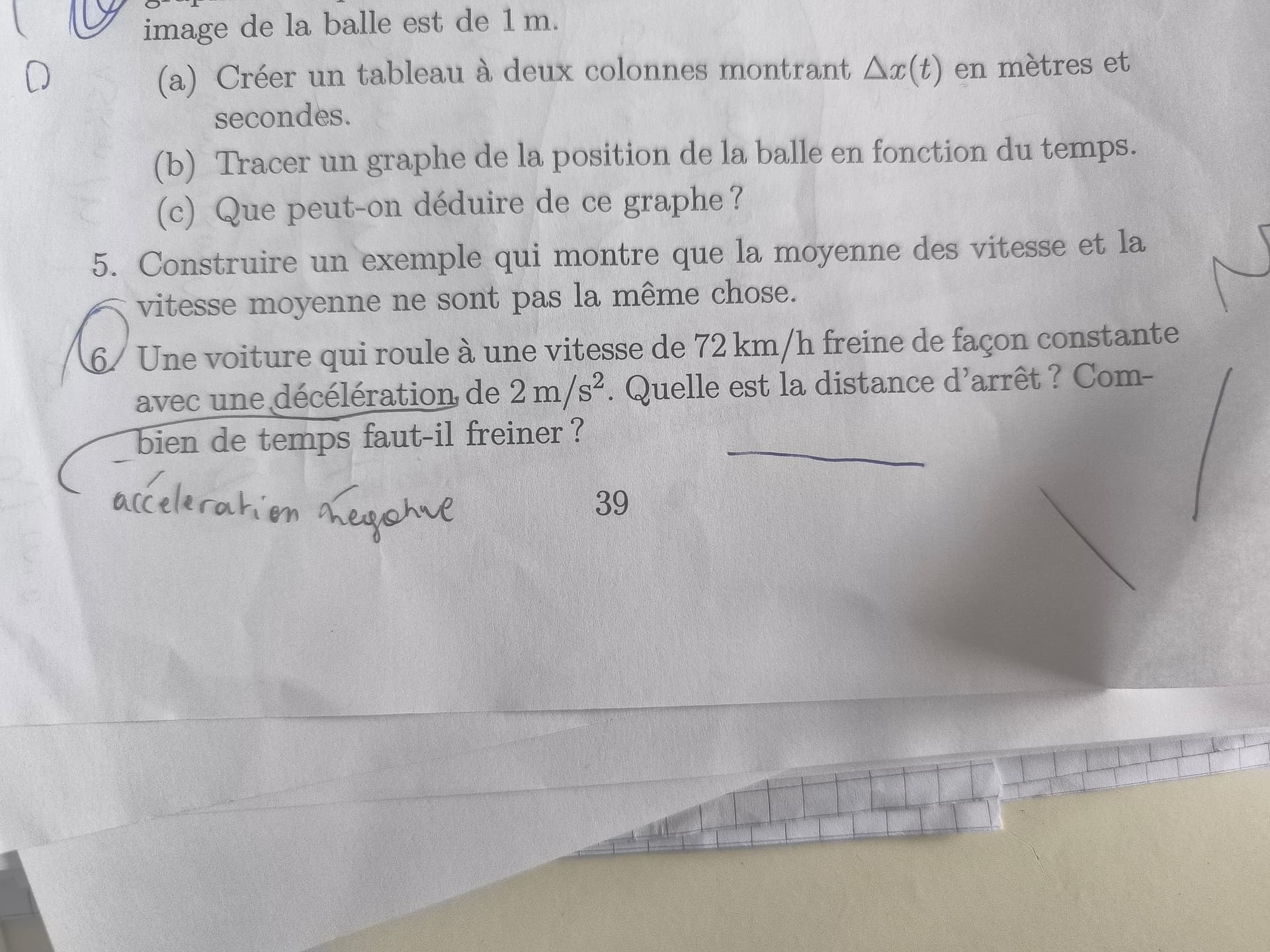 - Vitesse initiale : 72\ \text{km/h}. Convertie en m/s : 72\ \text{km/h}=72\cdot\frac{1000}{3600}\ \text{m/s}=20\ \text{m/s}. Donc v_0=20\ \text{m/s}.