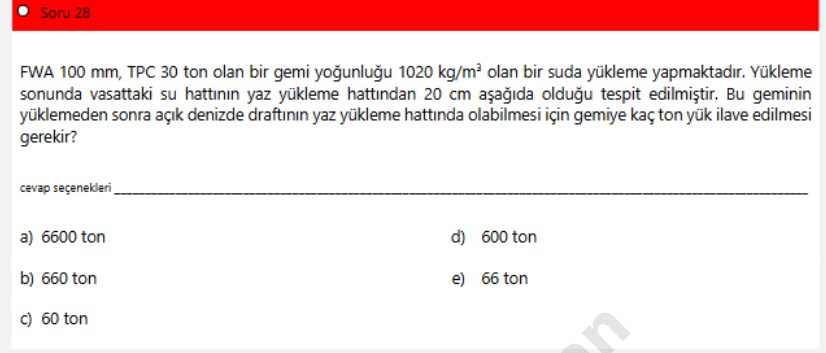 Bu metin, denizcilik ile ilgili problem içeren bir soru ve cevap seçeneklerinden oluşmaktadır. Soru, bir geminin draft ayarlaması ve gerekli yük miktarının hesaplanması üzerine olup, genellikle denizcilik mühendisliği veya gemicilikle ilgilenen öğrencilere yöneliktir.