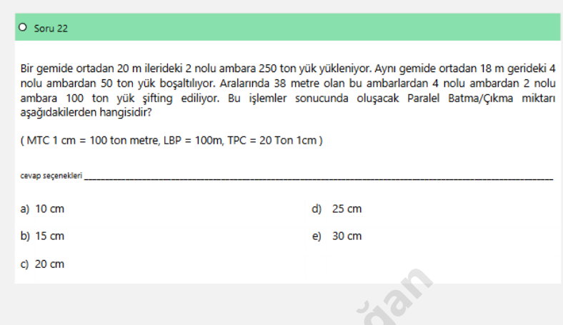 Bu görsel bir denizcilik matematik sorusunu içermektedir. Belirli yük değişikliklerinin bir gemi üzerindeki etkileri hesaplanarak paralel batma veya çıkma miktarı sorulmaktadır. Soruda çeşitli mesafeler ve tonajlar verilmiş, yanıtlardan biri seçilmelidir.