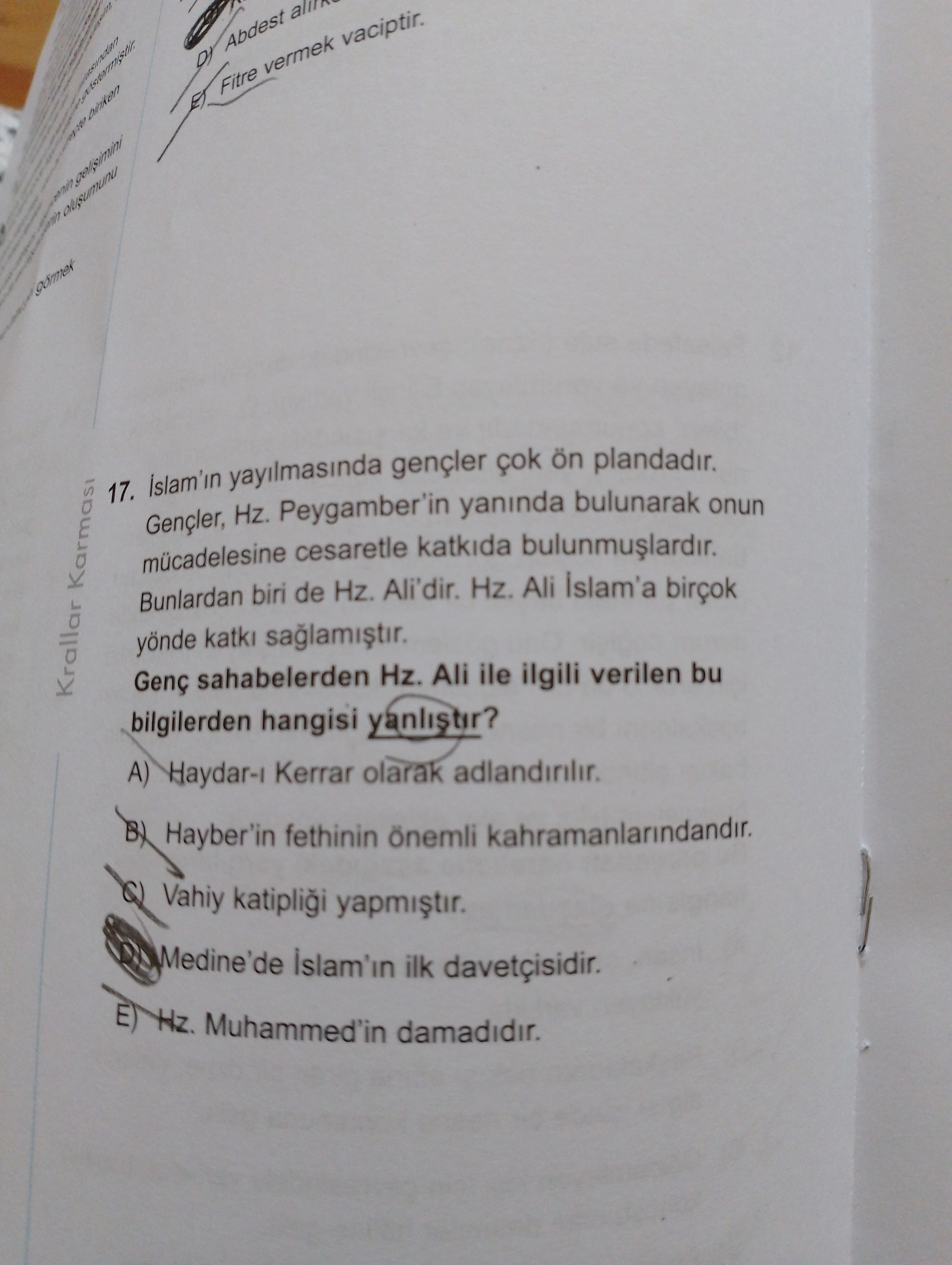 Kısa açıklama: Görselde Din Kültürü/İslam tarihi konulu çoktan seçmeli bir soru yer alıyor; genç sahabelerin, özellikle Hz. Ali’nin İslam’ın yayılmasındaki rolü hakkında verilen ifadelerden hangisinin yanlış olduğu soruluyor. Üstte ayrıca fitre ve abdestle ilgili başka bir sorunun seçenekleri kısmen görünüyor.
