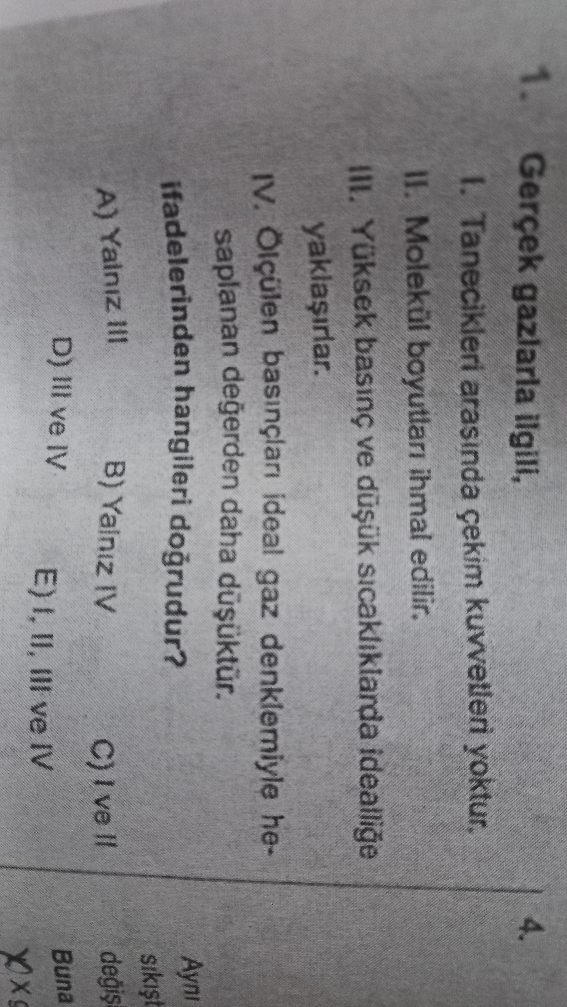 Genel açıklama: Görsel, kimya alanında gerçek ve ideal gazların özelliklerini sorgulayan çoktan seçmeli bir test sorusunu içeriyor; basınç, sıcaklık, molekül boyutu ve tanecikler arası etkileşimler gibi kavramlara odaklanıyor.
