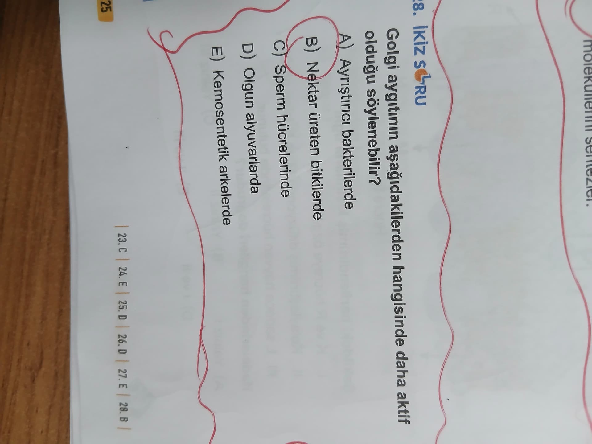Golgi aygıtı salgılanacak protein ve polisakkaritleri işleyip paketlediği için, yoğun salgı faaliyeti olan nektar üreten hücrelerde daha aktiftir. (A ve E prokaryotlardır — Golgi yok; D olgun alyuvarlarda organeller yok; C’de olgun sperm hücreleri organelce fakirdir, Golgi yalnızca spermiogenez sırasında akrozomu oluştururken etkindir.)