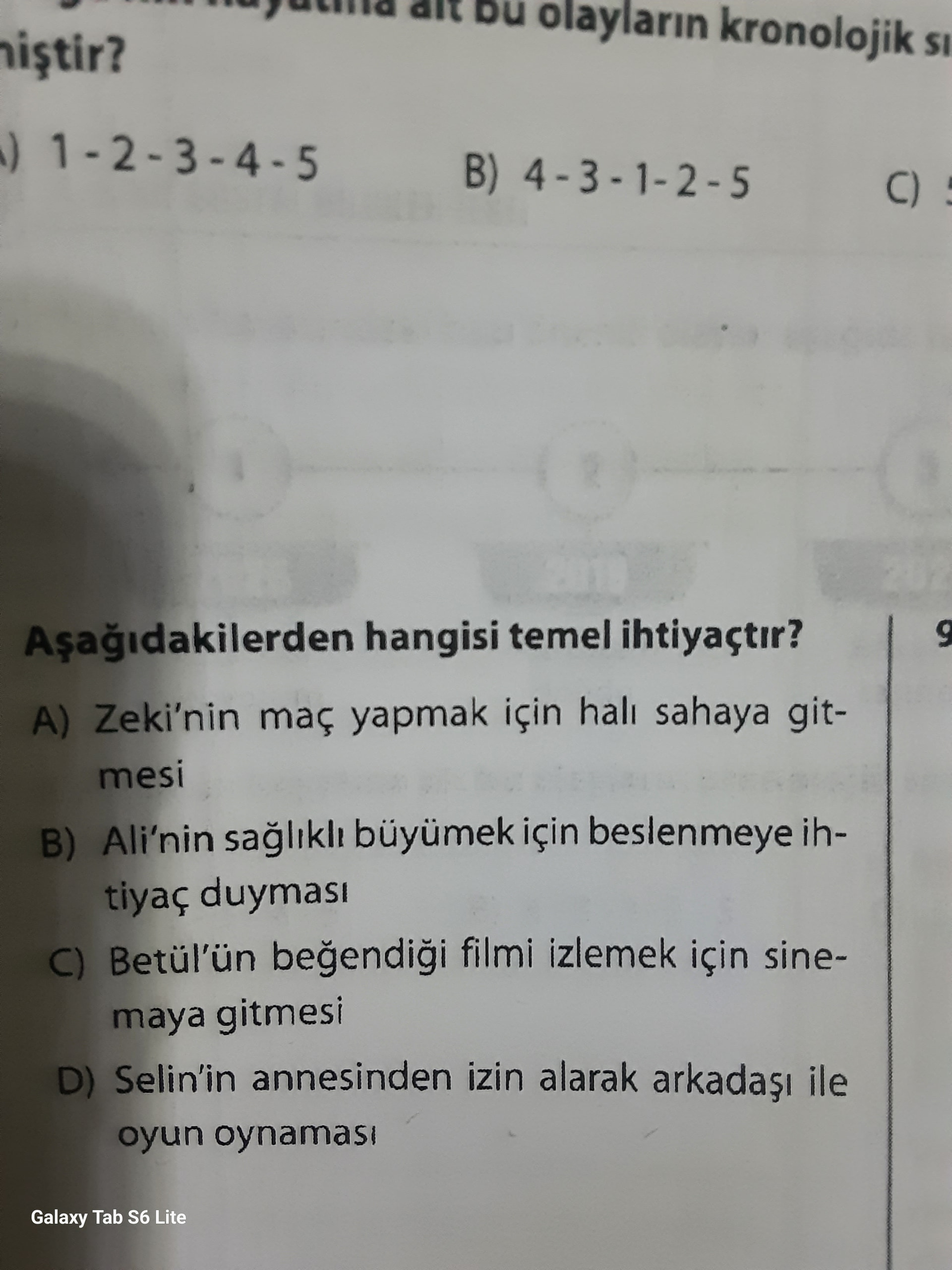 Genel açıklama: Görsel bir test sayfasına ait çoktan seçmeli sorular içeriyor. Üstte kronolojik sıralamayı bulmaya yönelik bir soru, altta ise temel ihtiyaçları ayırt etmeye yönelik bir soru yer alıyor.