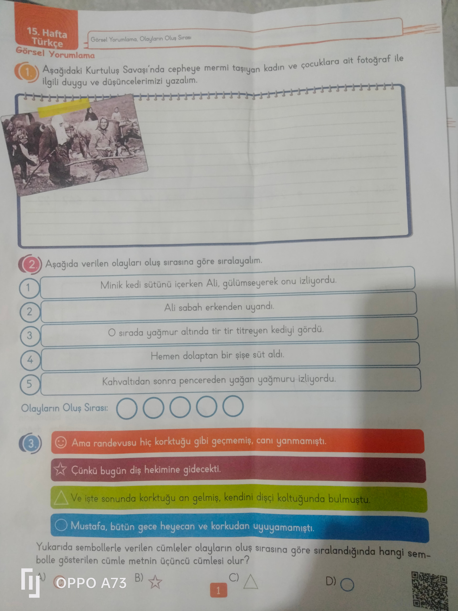 Özet: Sayfa, görsel yorumlama ve olayların oluş sırasını belirleme etkinliklerinden oluşuyor. İlk bölümde Kurtuluş Savaşı’nda cephane taşıyan kadın ve çocuklarla ilgili duygu-düşünceler yazılacak boş bir alan var. İkinci bölümde Ali ve bir kediyle ilgili beş olay, kronolojik sıraya dizilecek. Üçüncü bölümde ise sembollerle verilen cümleler doğru sıraya konularak metnin üçüncü cümlesinin hangi sembol olduğu seçilecek.