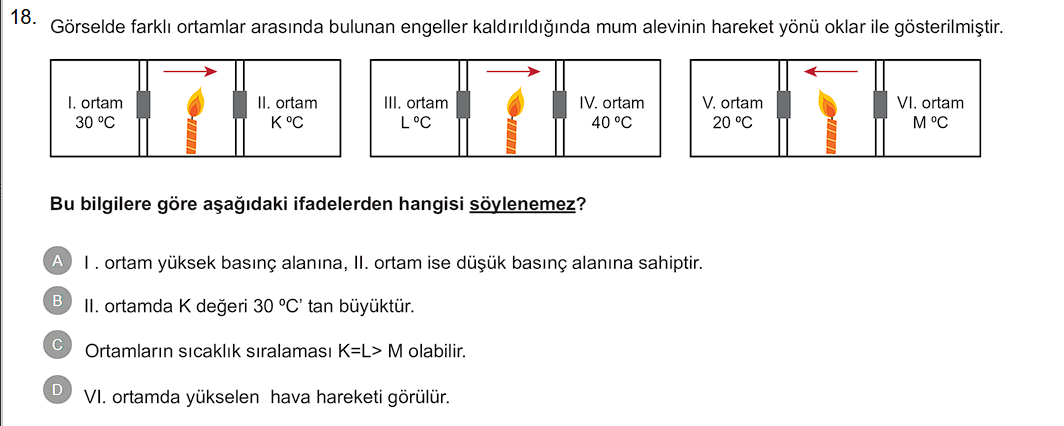 Açıklama kısa: Resimlerde oklar sıcaklık farkına bağlı olarak havanın üst kısımdan daha soğuktan daha sıcağa doğru aktığını gösteriyor (II. panelde 40 °C olan tarafa ok sağa, dolayısıyla o taraf daha sıcak). Buna göre I. ortamın II. ortama göre daha yüksek basınca sahip olduğu (A) ve II. ortamın K değerinin 30 °C’den büyük olduğu (B) çıkarılabilir; K = L > M sıralaması (C) resimlerle çelişmez ve mümkün olabilir. III. panelde ok sola yöneldiğine göre V ortamı (20 °C) VI’dan daha sıcaktır; yükselen hava hareketi sıcak tarafta (V) görülür, VI’da değil — bu yüzden VI’da yükselen hava olduğu (D) söylenemez.
