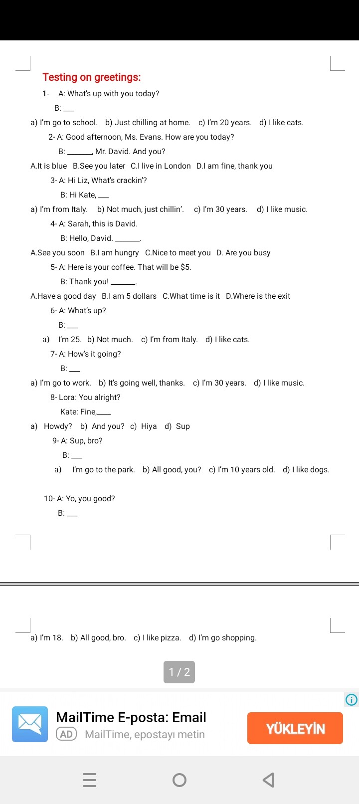 a) I’m 18. b) All good, bro. c) I like pizza. d) I’m go shopping.