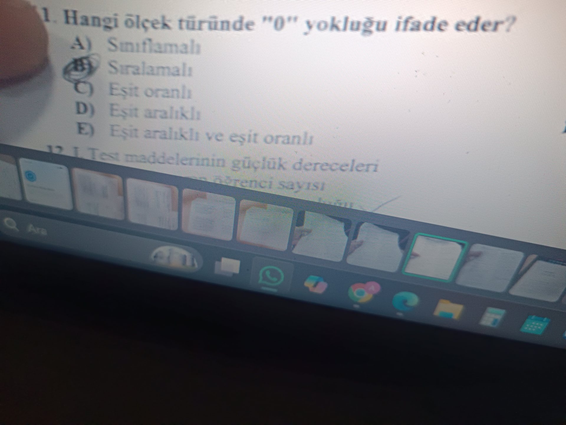 Genel açıklama: Görsel, ölçme-değerlendirme alanından çoktan seçmeli bir sınav sorusunu ve kısmen bir sonraki soruyu içeriyor; ölçek türleri (sınıflama, sıralama, eşit aralık, eşit oran) ve test maddelerinin güçlük dereceleri gibi konulara değiniliyor.