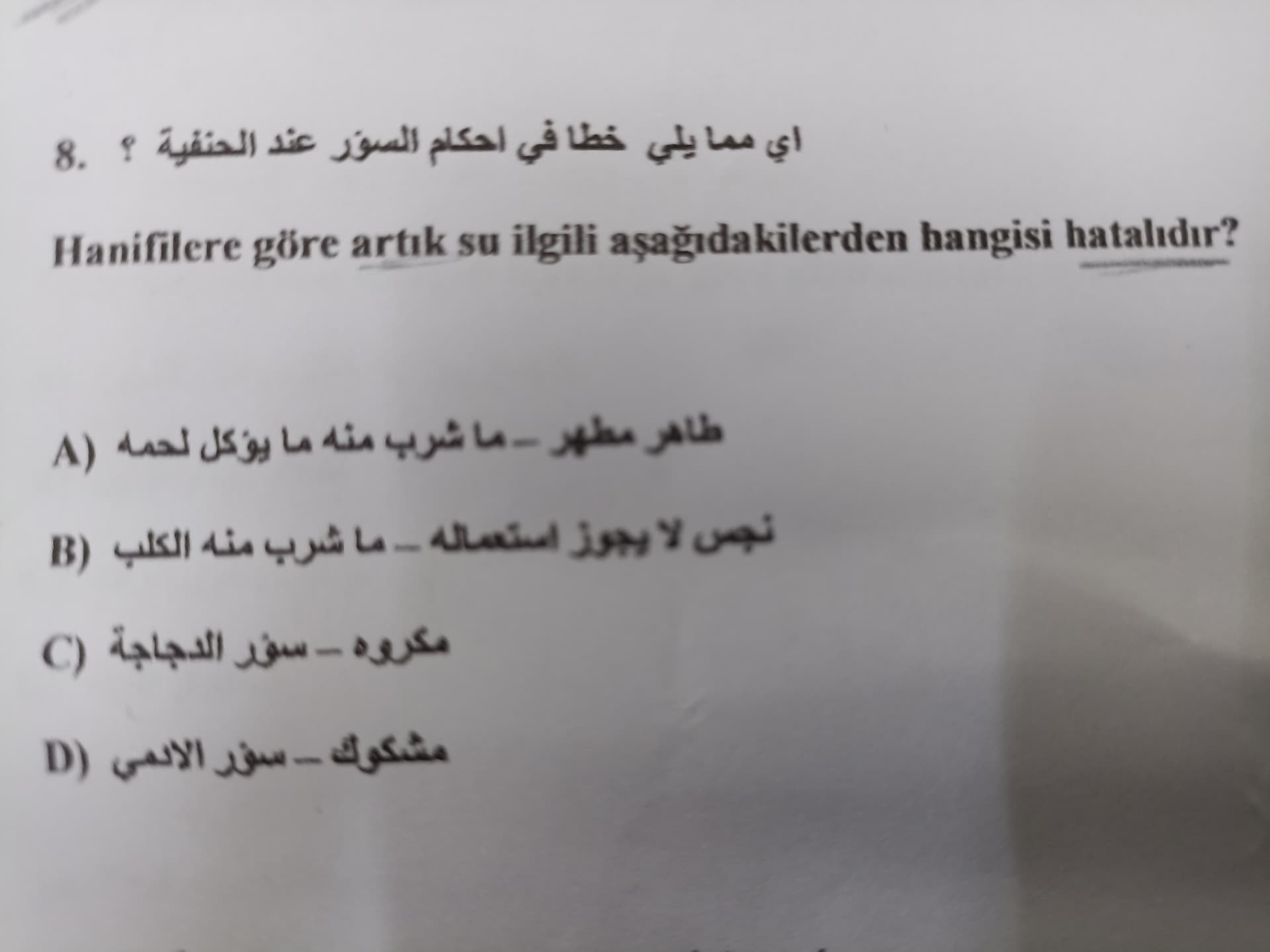 - C (Doğru): Kanatlı ve normal yenilen kümes hayvanlarının (ör. tavuk) tükürüğü / onun içtiği su Hanefilere göre genelde makrûh şeklinde sınıflandırılmaz; aslında temiz sayılır — fakat sınava yönelik şıklarda C farklı bir nüansa işaret ediyorsa dikkat edilir.
