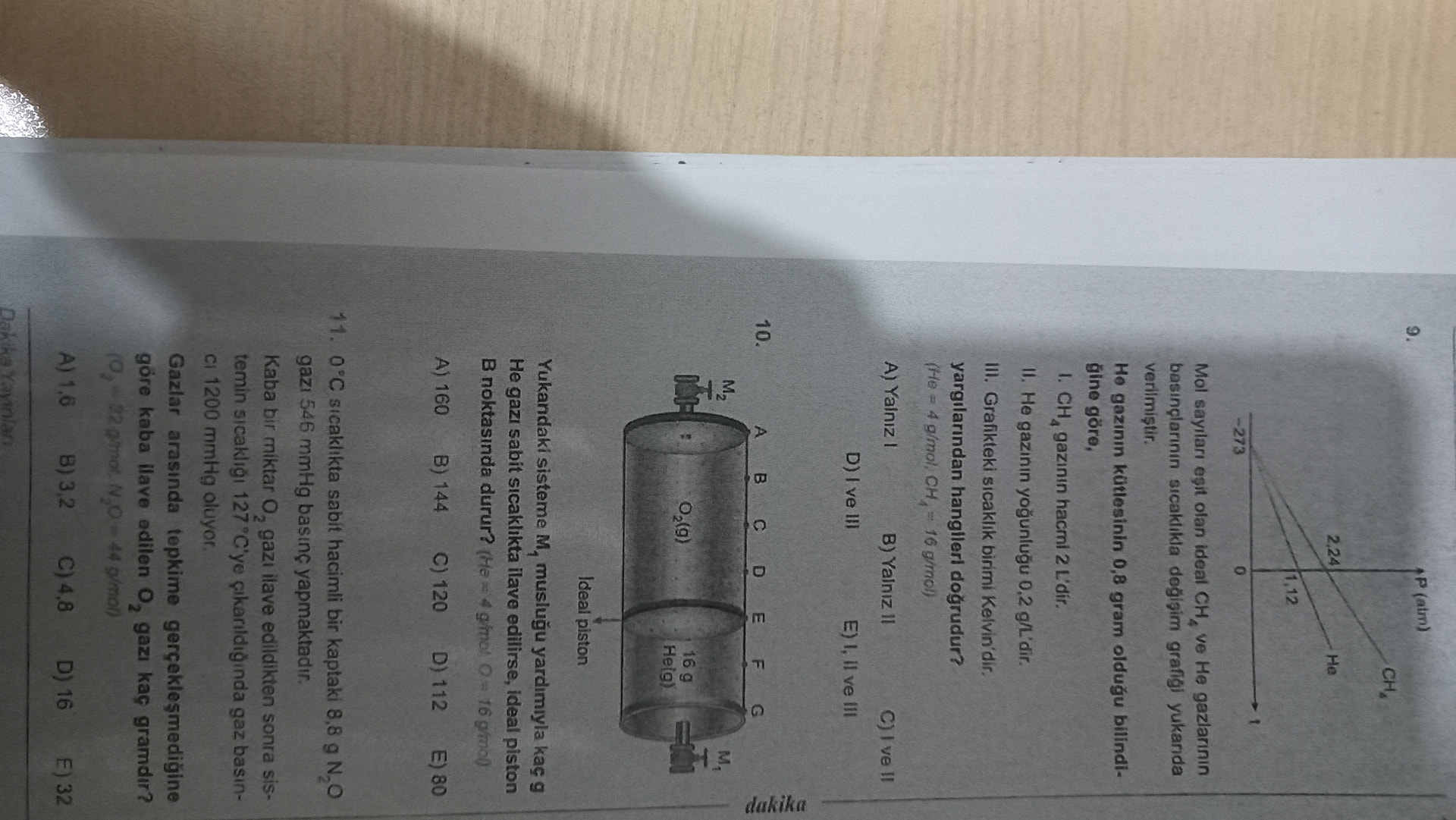 [Grafik: Dikey eksen P (atm). Yatay eksen sıcaklık. Yatay eksende -273, 0, 112, 224 işaretli. İki doğru: CH4 ve He.]