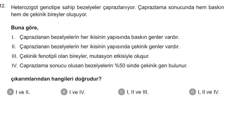 Açıklama: Heterozigot × heterozigot (ör. Aa × Aa) çaprazlamada genotip oranı 1:2:1 yani AA : Aa : aa = 1/4 : 1/2 : 1/4 olur. Bu yüzden I (her iki ebeveynde baskın gen vardır) ve II (her iki ebeveynde çekinik gen vardır) doğrudur. III yanlıştır — çekinik fenotip, mutasyon sonucu oluşmaz; iki çekinik allelin bir araya gelmesinden kaynaklanır. IV yanlıştır çünkü çekinik alleli taşıyan bireylerin oranı Aa ve aa toplamı ile 1/2 + 1/4 = 3/4 (yani %75) olur; çekinik fenotip ise sadece aa (%25) düzeyindedir, %50 değildir.