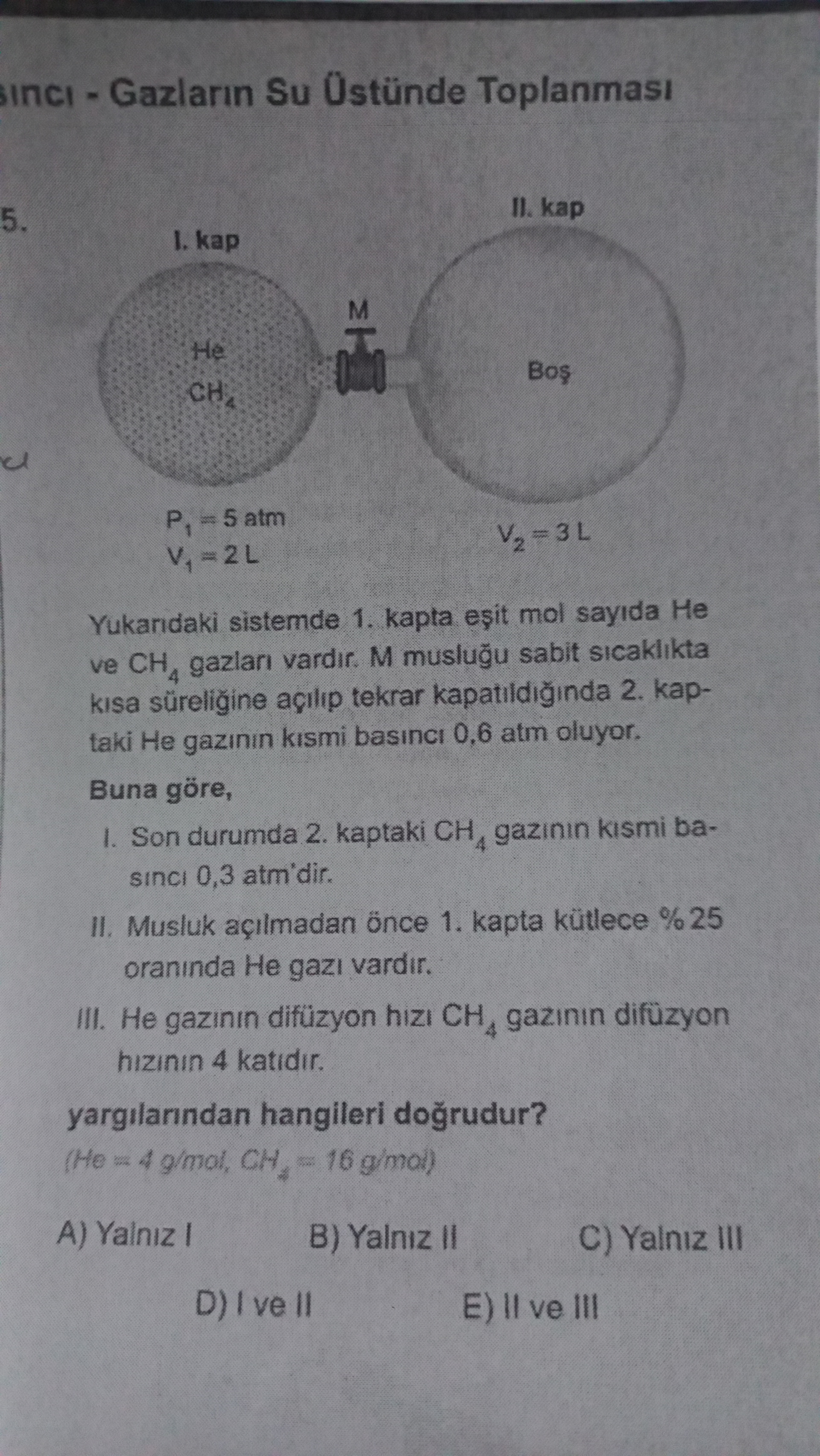 He başlangıçta sadece I. kaptaydı, şimdi bir kısmı I’de, bir kısmı II’dedir. Fakat soru, eşit mol sayıda He ve CH_4 var diyor; bu bilgi, seçenek 2’yi kontrol etmek için yeterli.