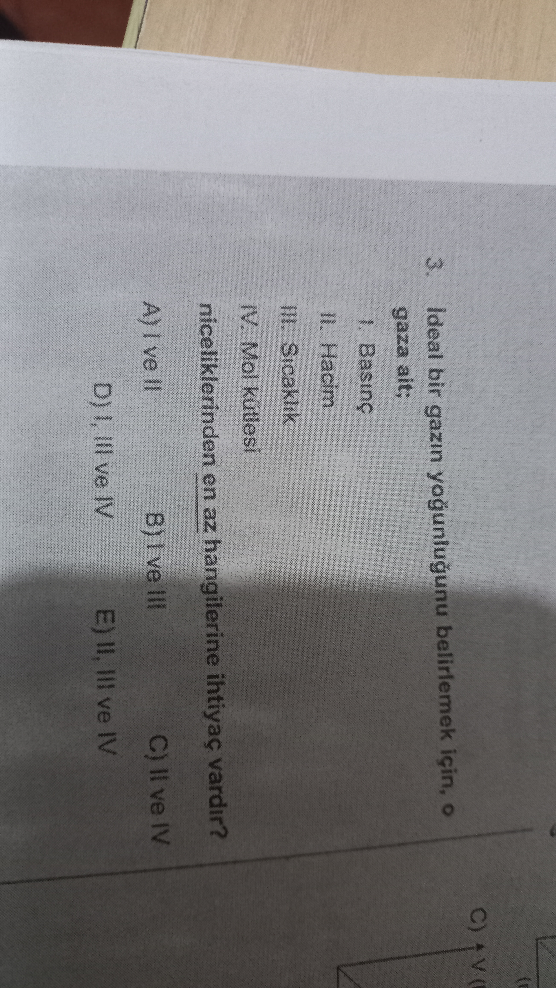 Soru, “en az hangileri” dediği ve ideal gazın yoğunluğunu belirlemek (yani karakterize etmek) istediği için, II (Hacim), III (Sıcaklık), IV (Mol kütlesi) birlikte alınır; bu yüzden E şıkkı işaretlenir.